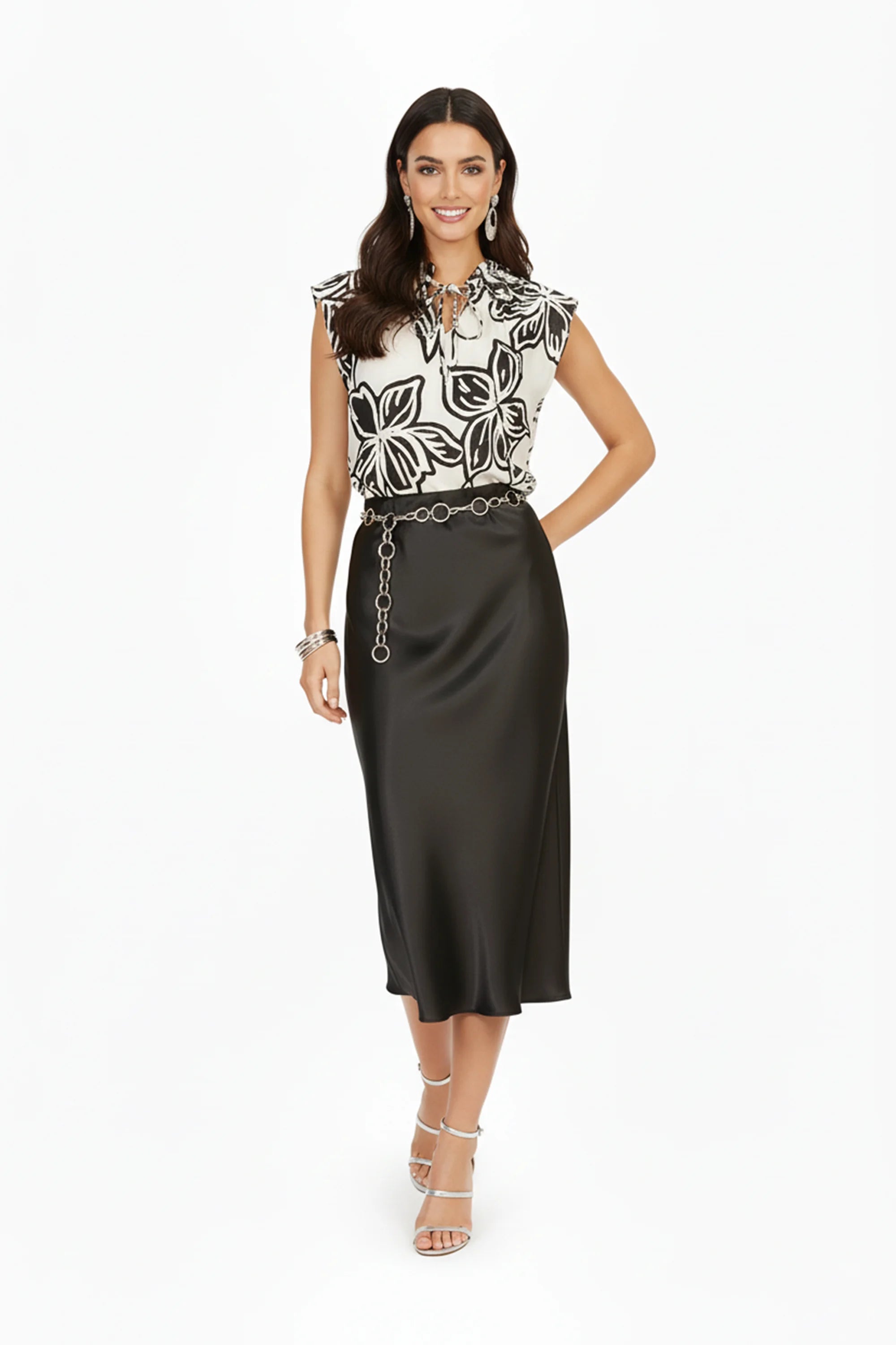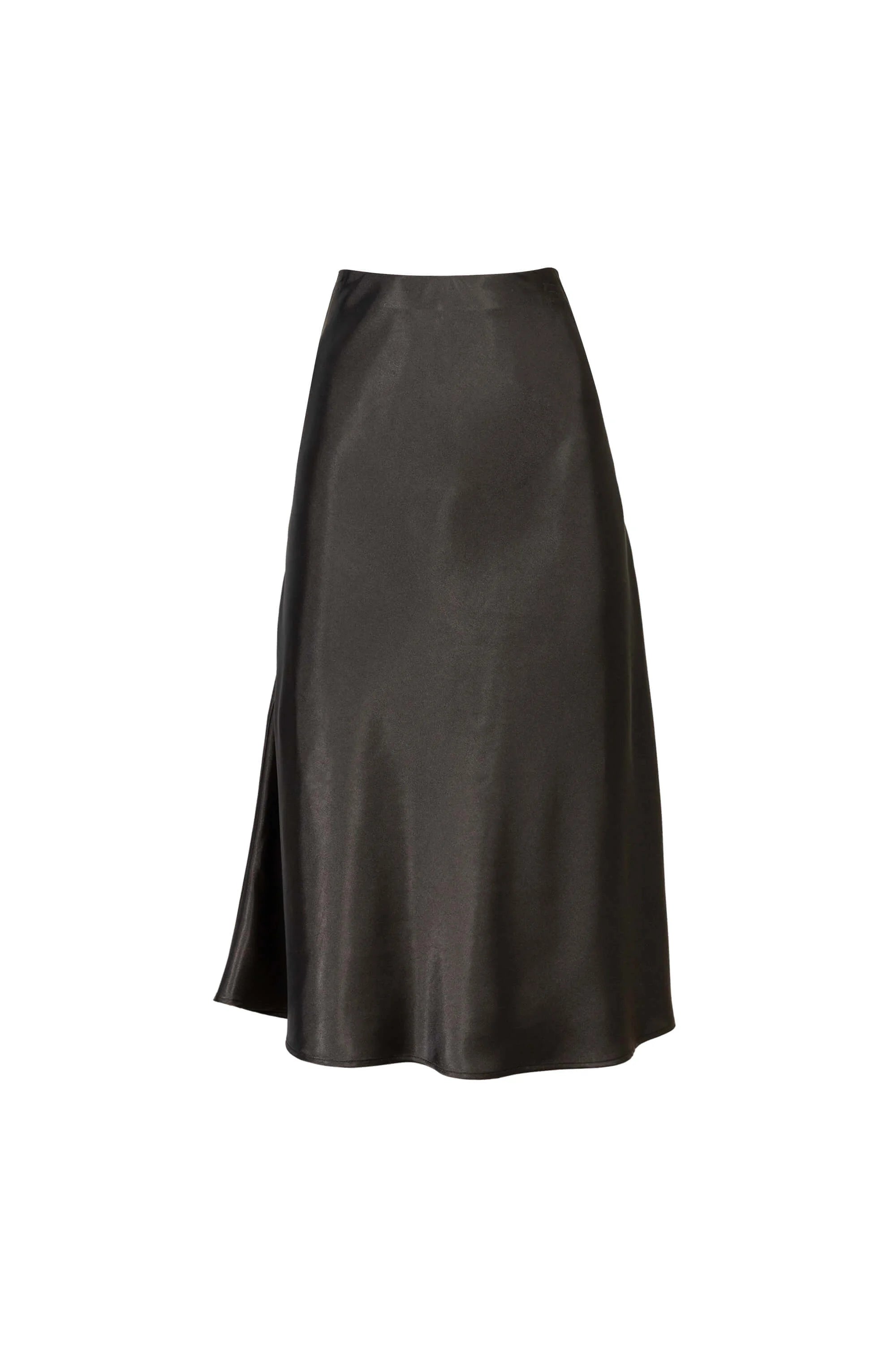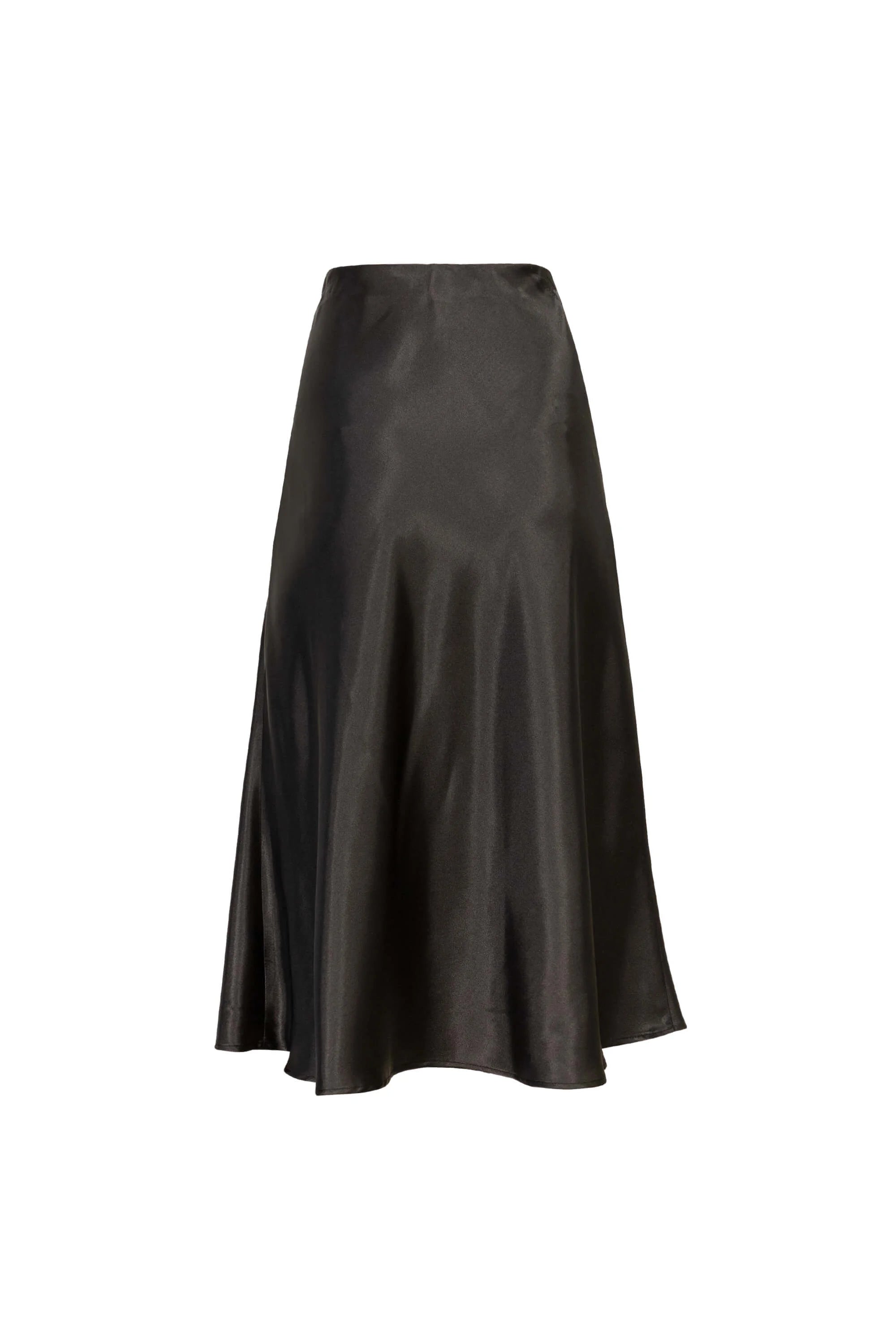 Esta falda en línea A de satín negro. Su silueta estructurada al cuerpo y sutilmente amplia hacia el ruedo estiliza la figura con naturalidad y libertad de movimiento.