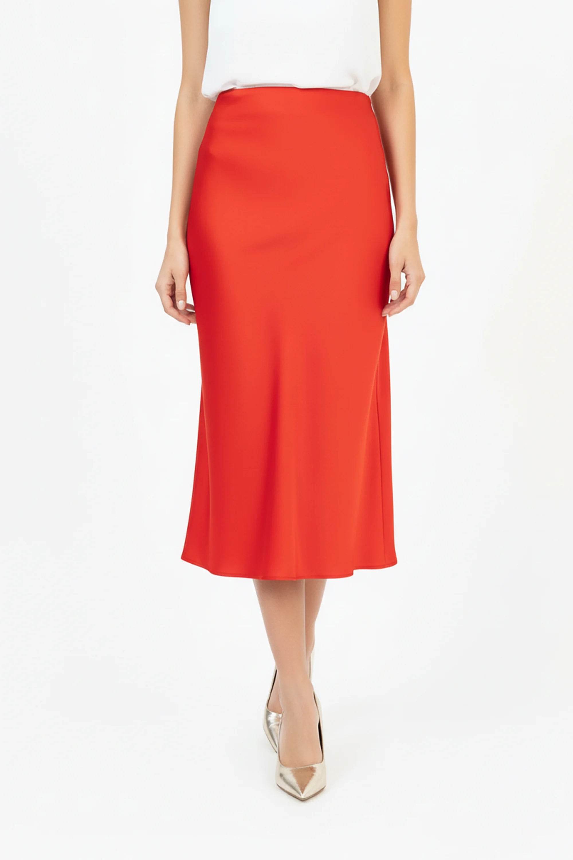 Esta falda en línea A de satín Su silueta estructurada al cuerpo y sutilmente amplia hacia el ruedo estiliza la figura con naturalidad y libertad de movimiento.