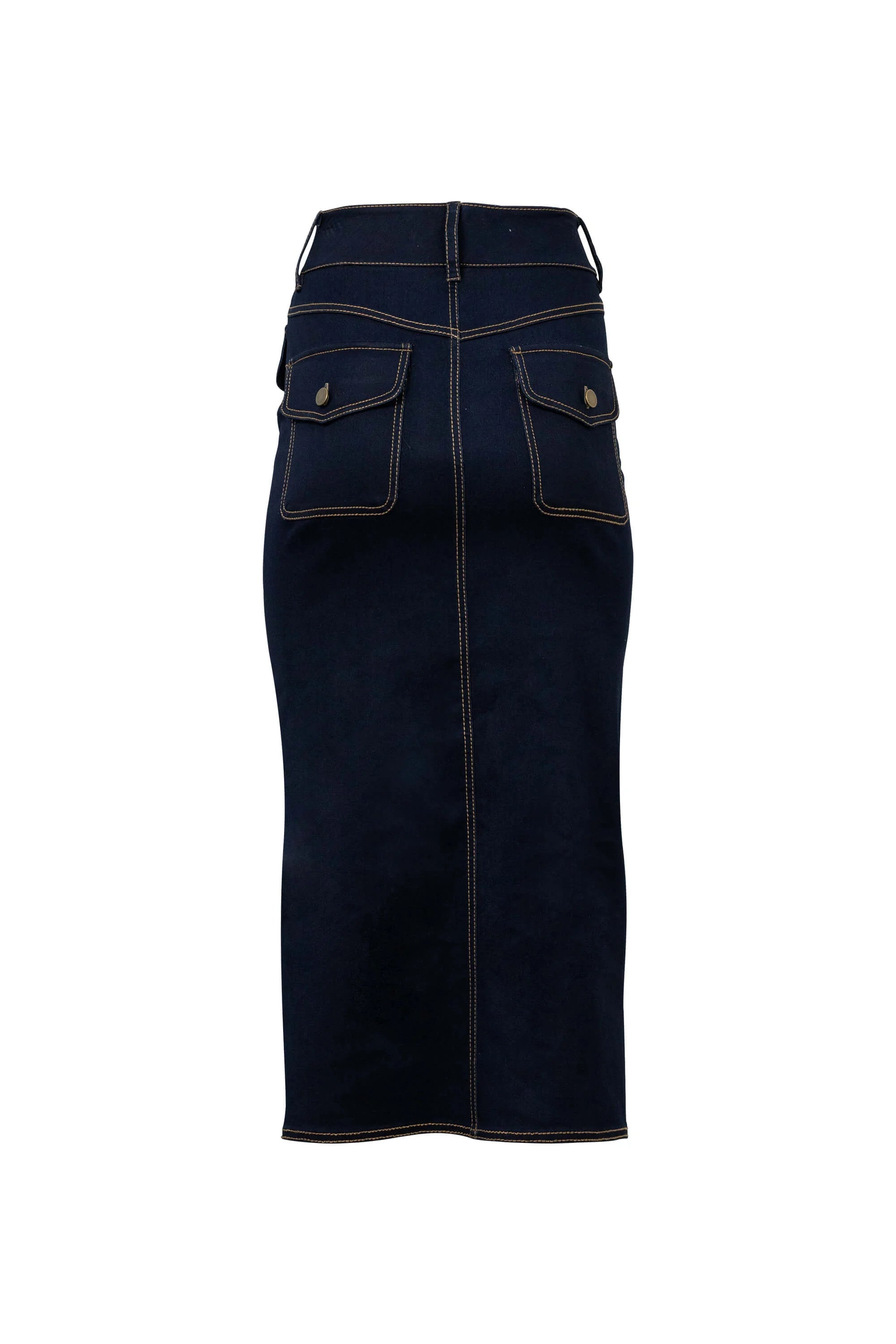 Falda lápiz de tiro alto con diseño estructurado y detalles utilitarios. Presenta abertura frontal que aporta comodidad y un toque moderno, además de bolsillos con tapa y botones decorativos en la parte superior. La pretina doble con presillas para cinturón refuerza la silueta definida y elegante. Su confección en tejido firme la convierte en una prenda versátil, ideal para looks formales, semi-formales o urbanos con estilo sofisticado