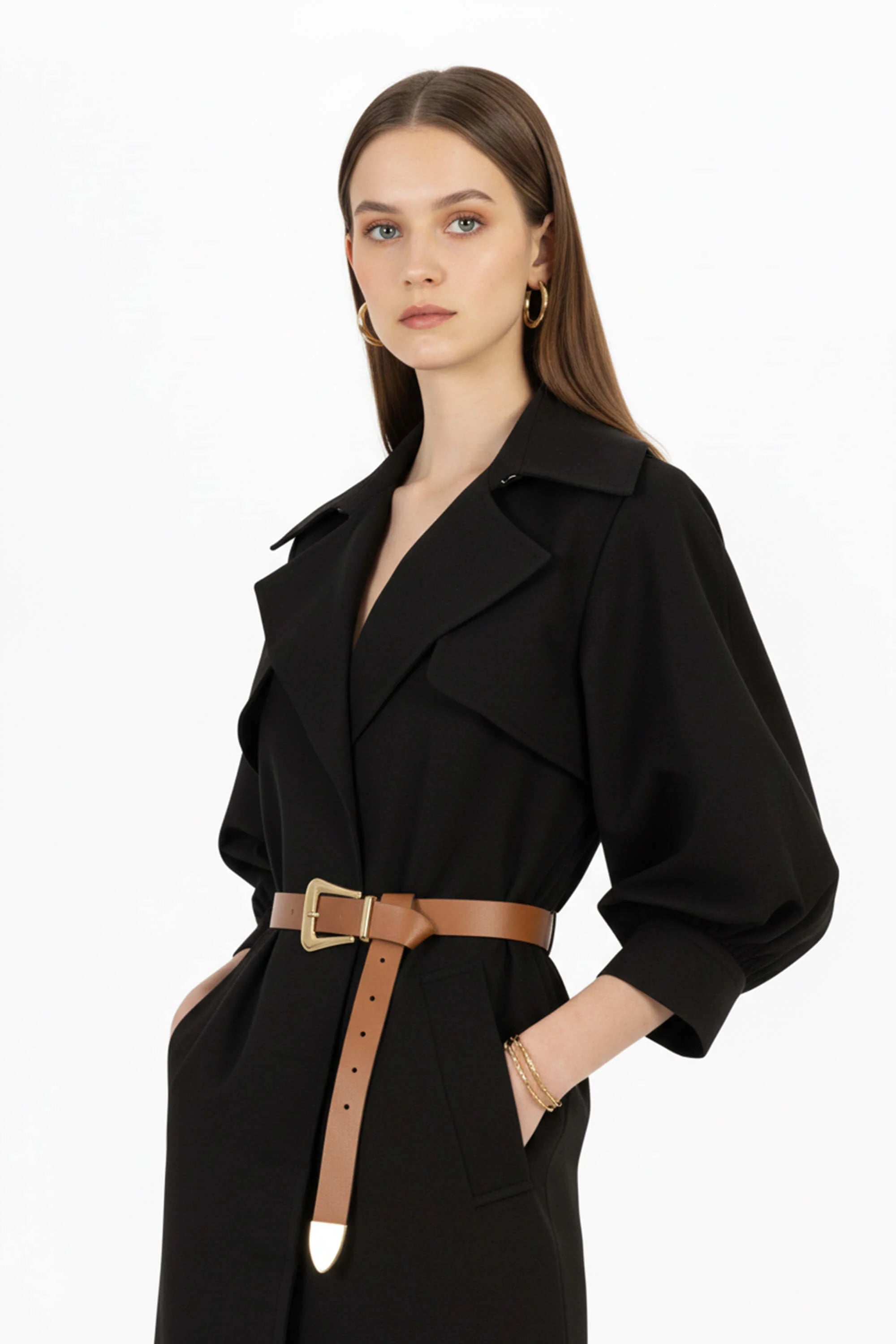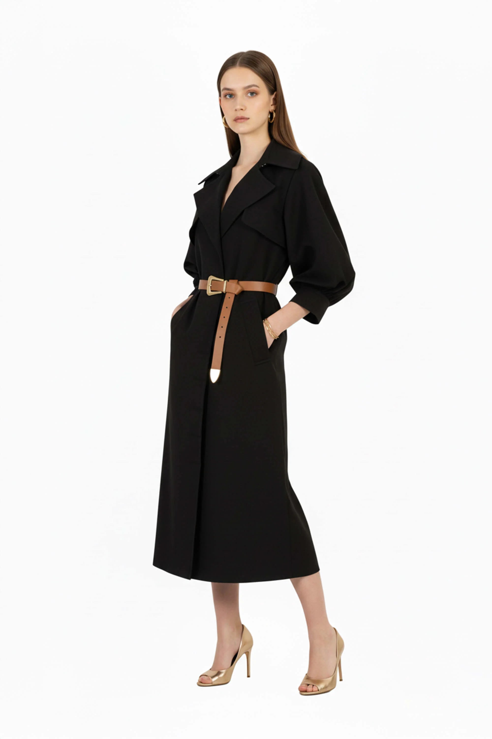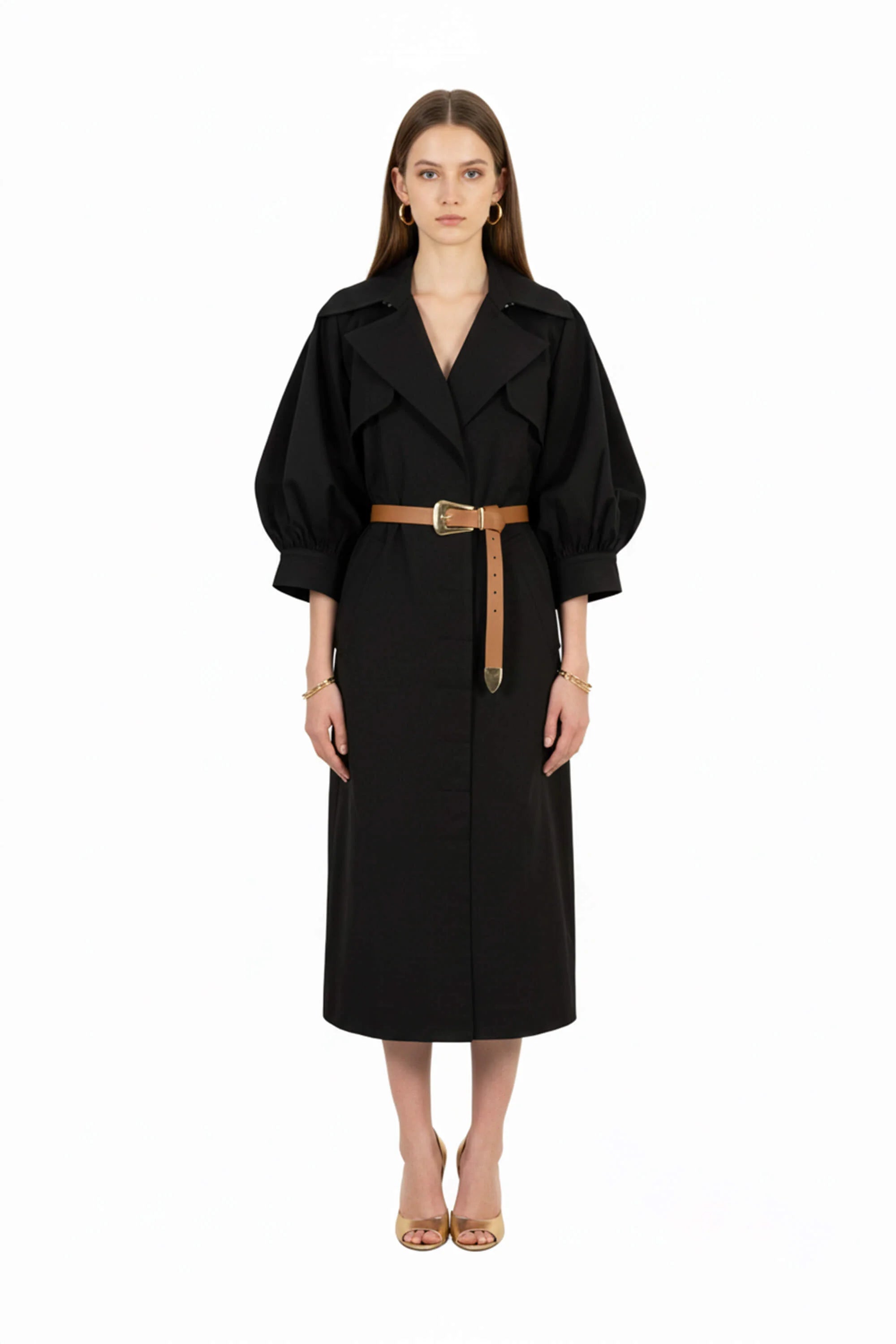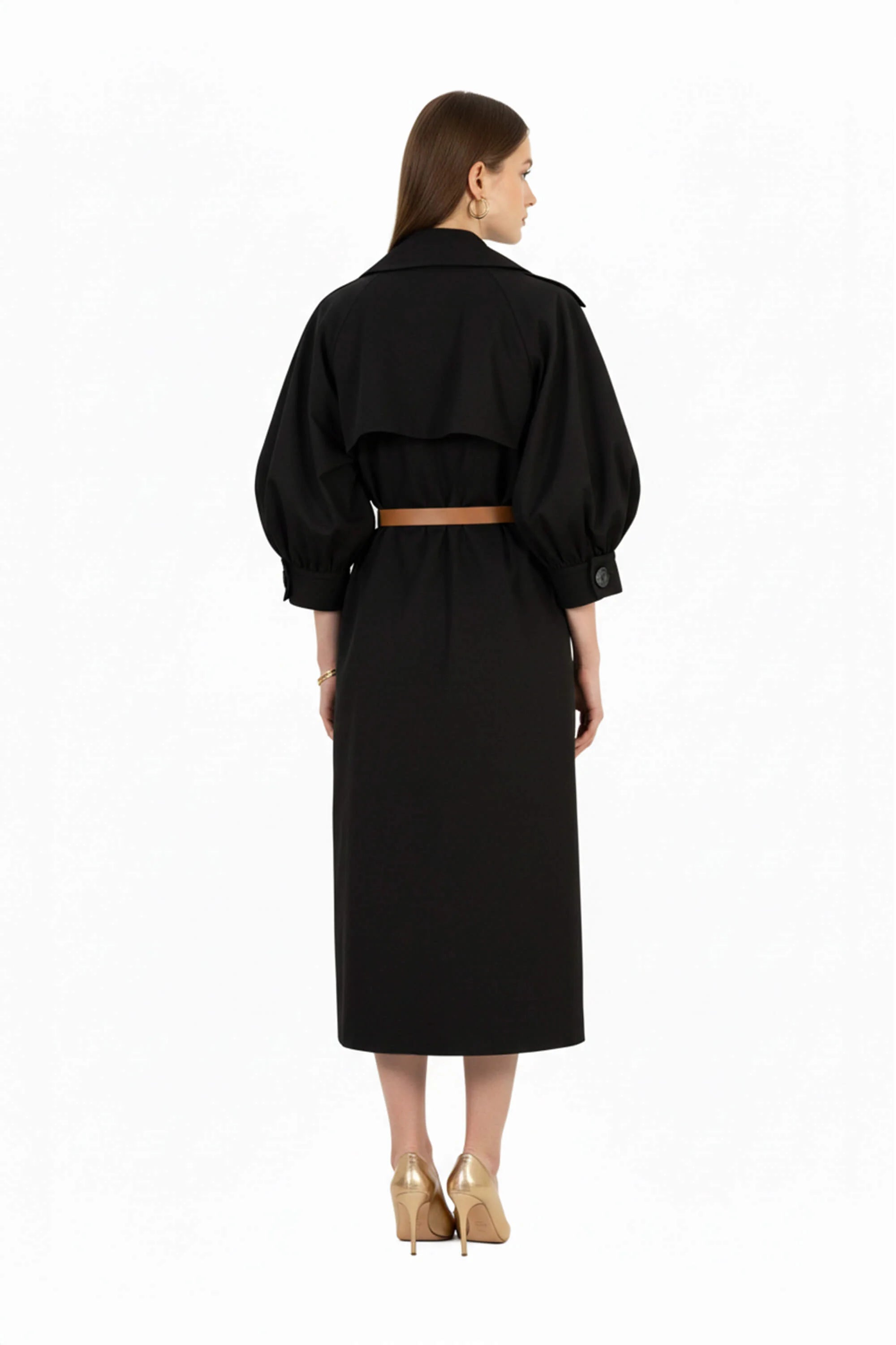 Gabardina de diseño exclusivo con cuello clásico y manga bishop.