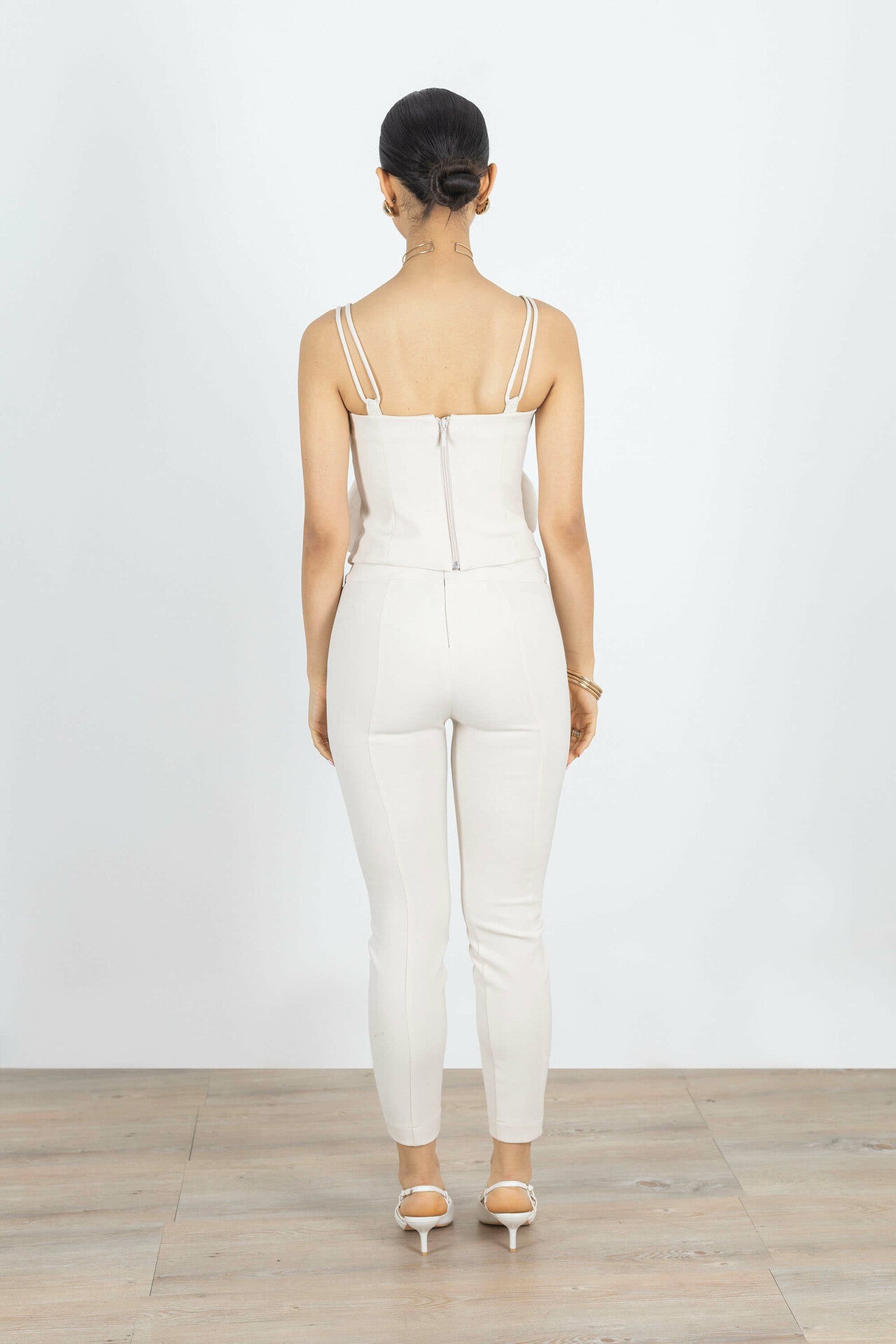 Este pantalón destaca por su impecable silueta de pierna recta y talle ultra alto, diseñada para alargar visualmente la figura y proporcionar una presencia de autoridad refinada. El punto focal de diseño son sus costuras verticales marcadas en el centro de cada pernera, que aportan una estructura arquitectónica y una verticalidad infinita a la prenda. Se caracteriza por una pretina ancha y limpia que proyecta una imagen de lujo contemporáneo y precisión sastre.