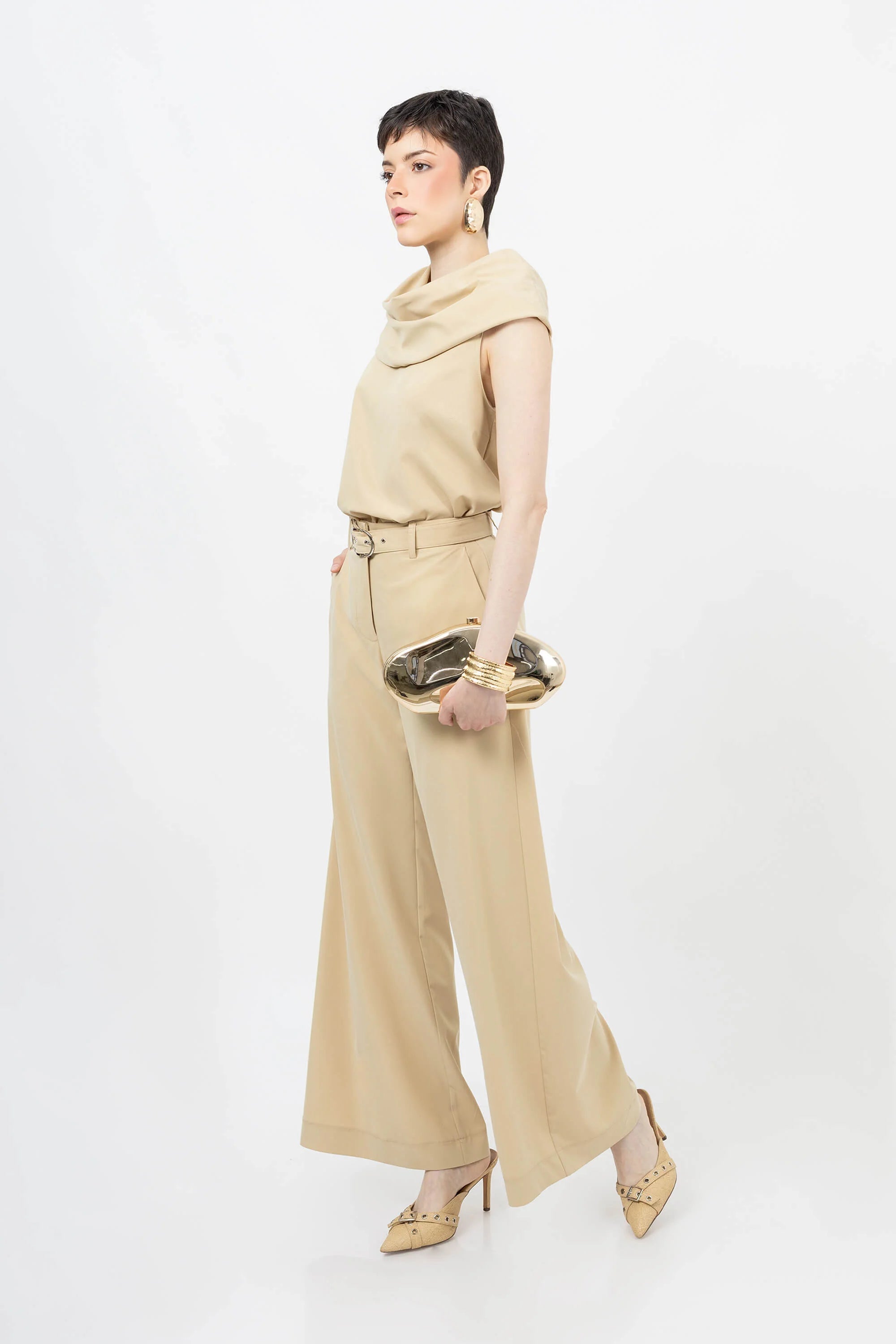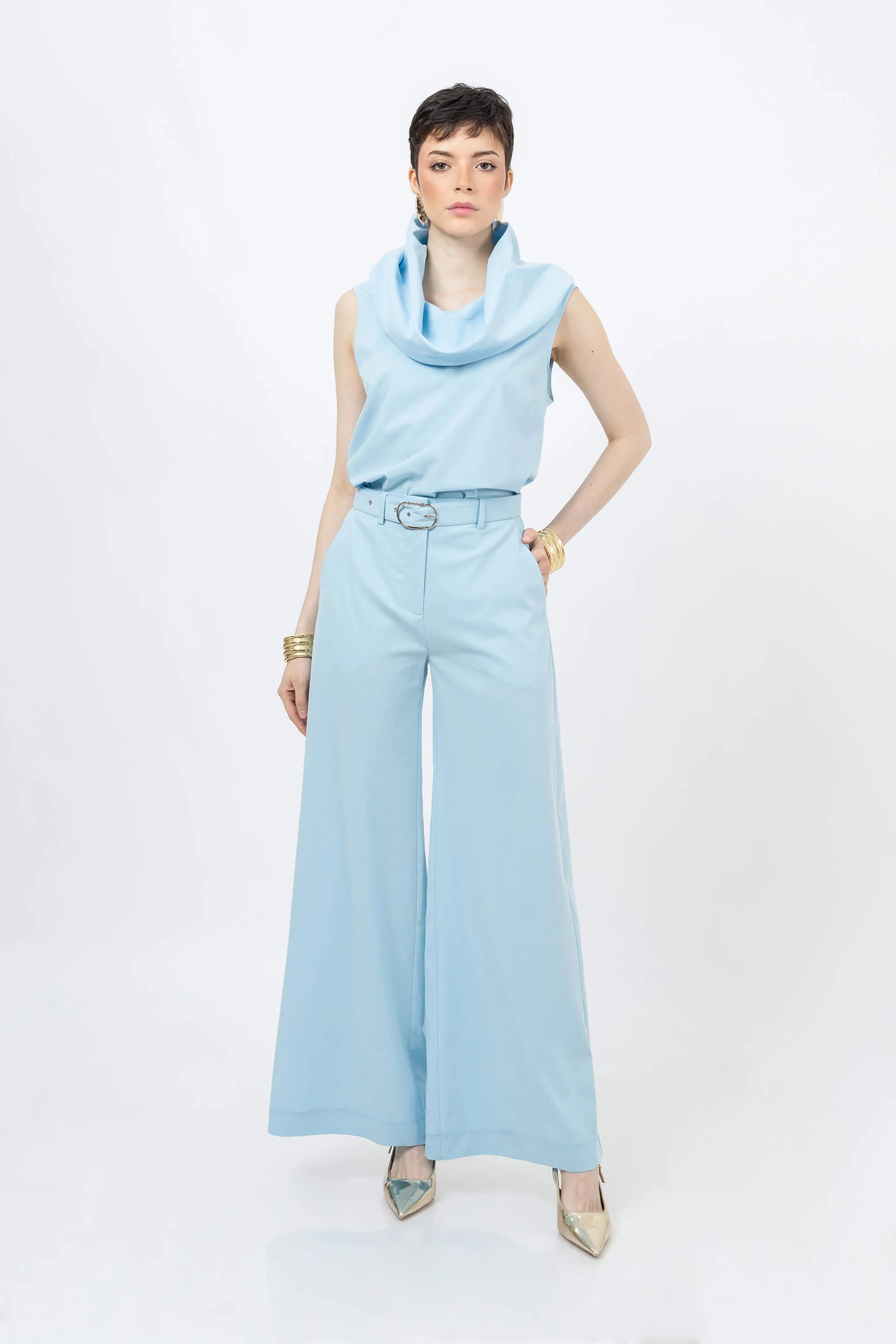 El modelo ofrece un ajuste de corte relajado, diseñado para fluir suavemente sobre el torso y ser llevado tanto por dentro como por fuera de prendas de talle alto. La parte posterior mantiene la limpieza visual del diseño, permitiendo que el drapeado del cuello caiga con elegancia sobre la parte superior de la espalda. Es una pieza de diseño de autor ideal para la mujer que busca una sofisticación poética mediante el uso de volúmenes limpios y textiles premium de última generación.