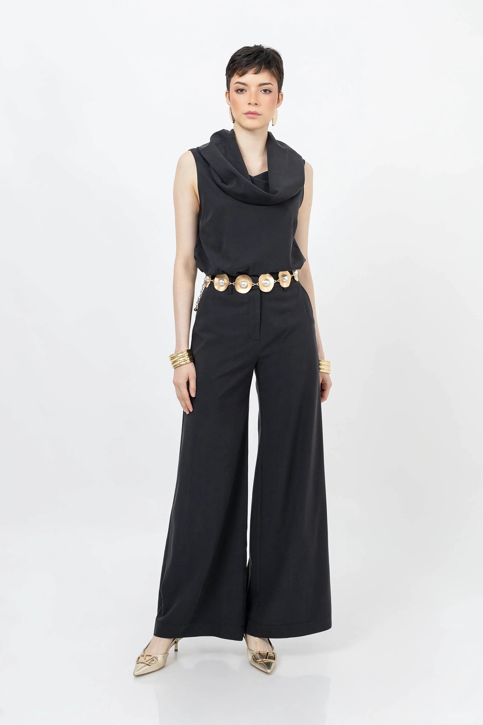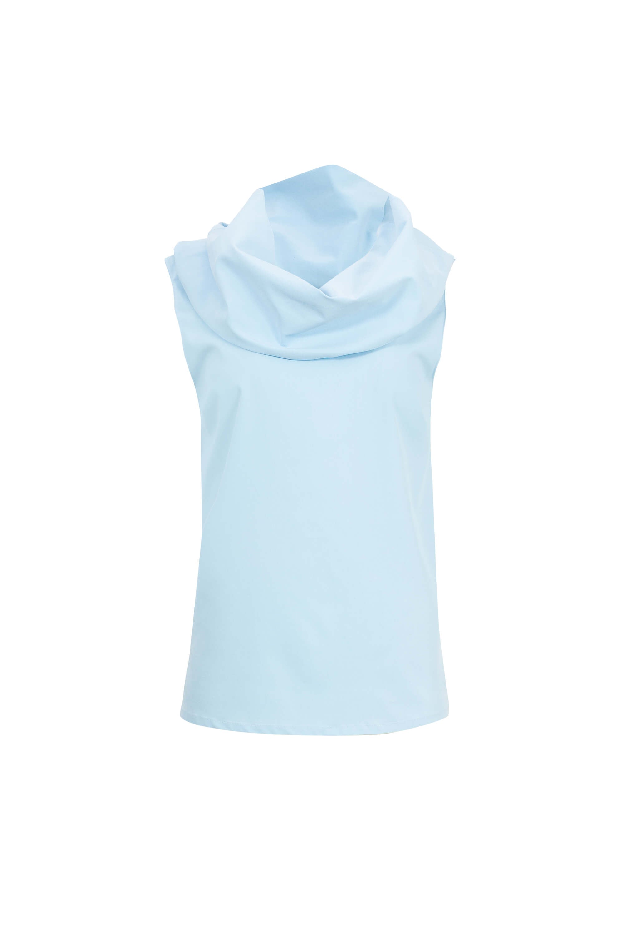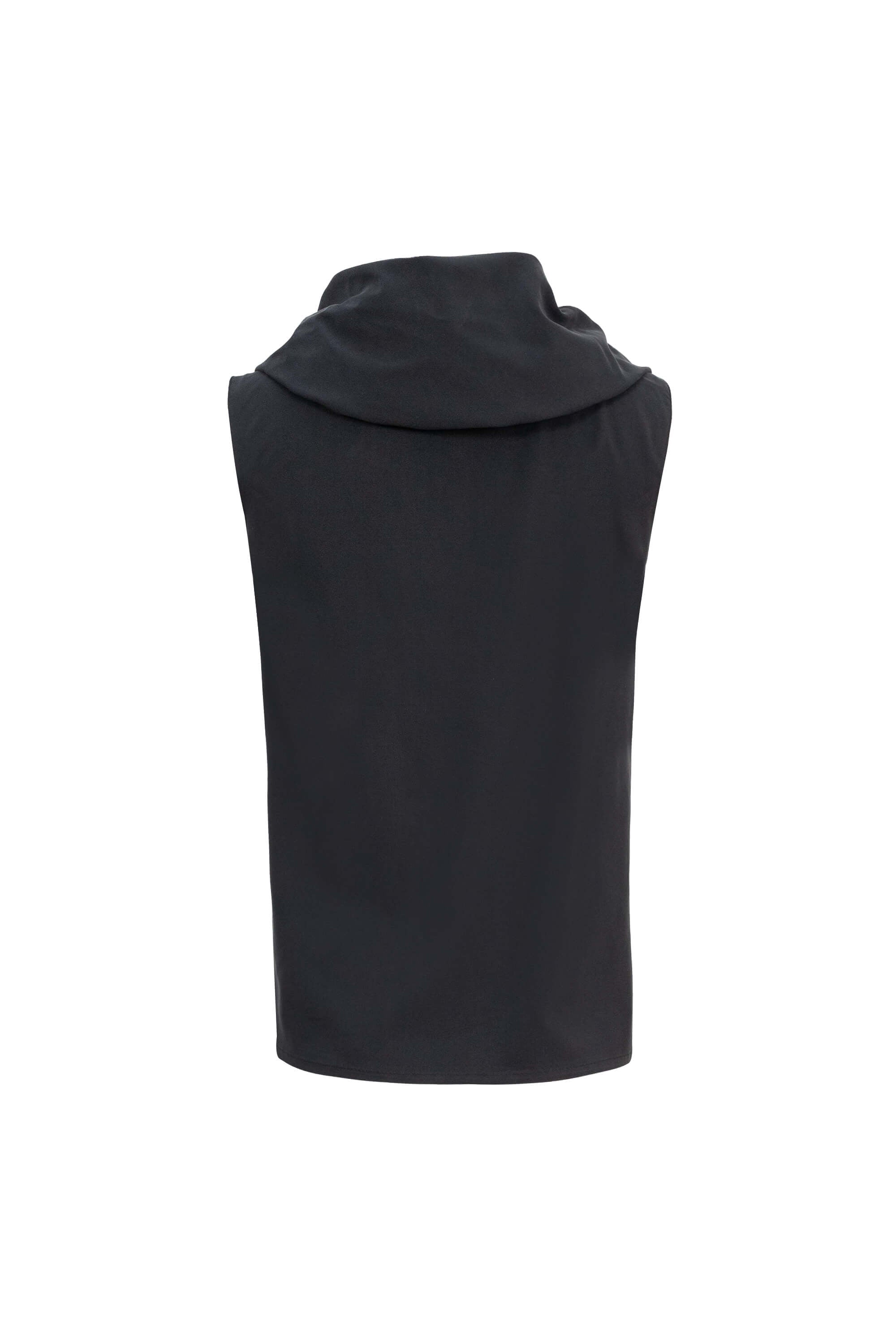 Este top destaca por su espectacular cuello tipo cowl (capucha) de gran volumen, que crea un drapeado artístico y fluido alrededor del cuello y los hombros. El diseño sin mangas realza la verticalidad de la pieza, mientras que la silueta de corte recto ofrece una estética minimalista que pone todo el foco visual en la arquitectura del escote.