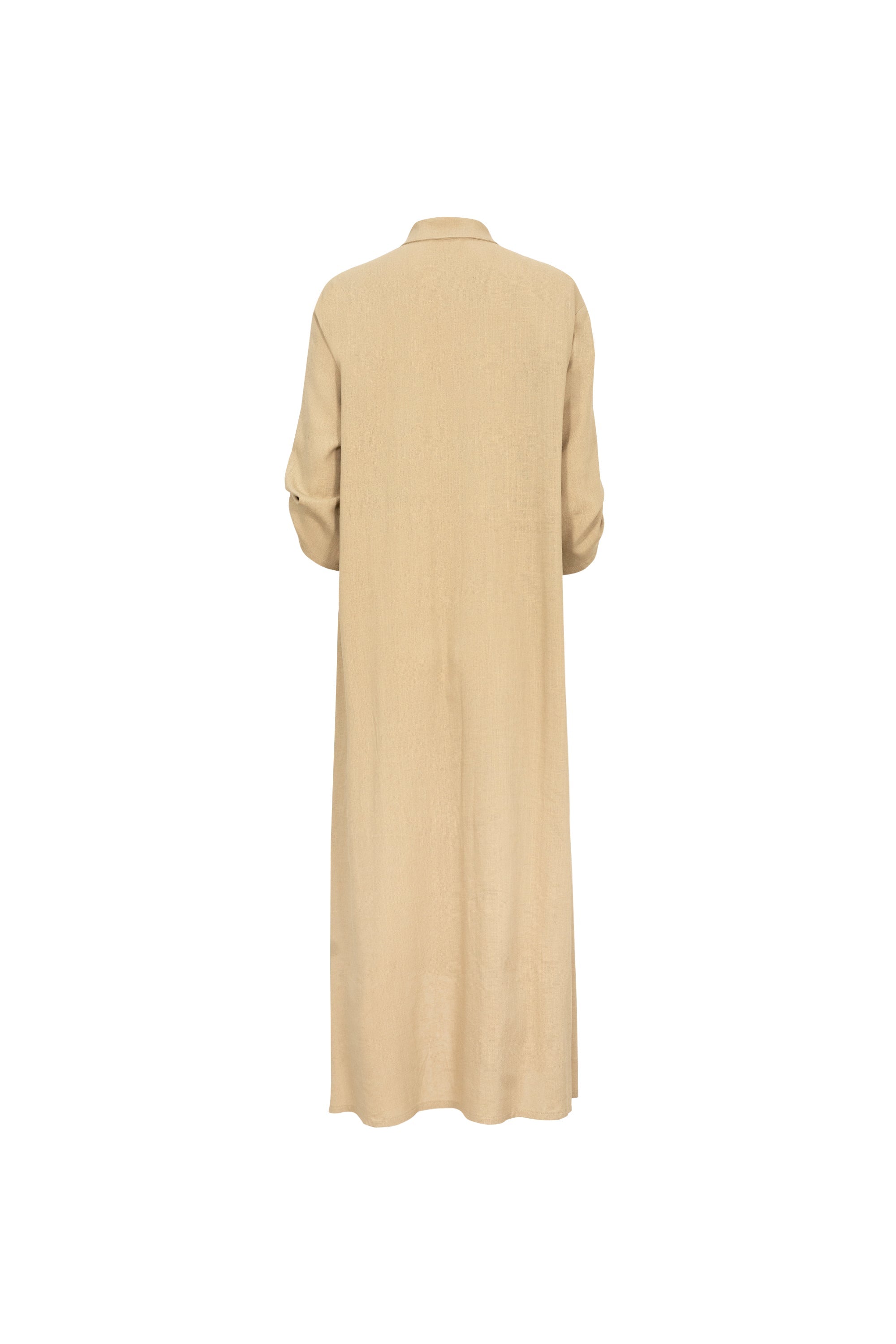 El modelo presenta un fit holgado y fluido que favorece la comodidad sin perder la estructura. Cuenta con un bolsillo de parche en el pecho que refuerza su aire utilitario y costuras reforzadas que garantizan la durabilidad de su forma asimétrica. Es una pieza sumamente versátil que puede lucirse como un vestido independiente o como una capa ligera sobre otras prendas, proyectando una imagen de lujo natural y minimalismo moderno.