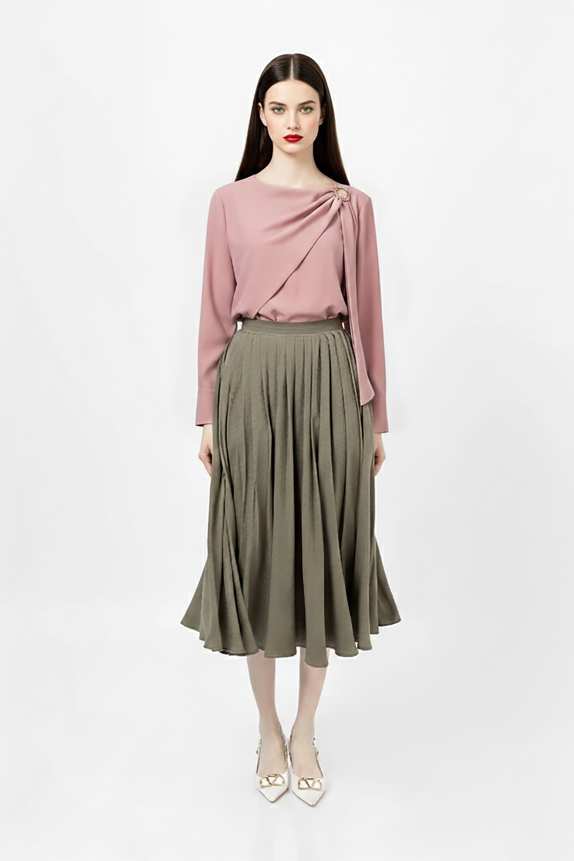 Esta blusa destaca por su refinada silueta de cuello redondo y corte asimétrico, que introduce una narrativa visual de lujo discreto. El punto focal de diseño es su sofisticado panel frontal drapeado, que nace de un elegante pliegue lateral y se asegura en el hombro mediante una hebilla circular metálica en tono dorado. Esta estructura crea líneas diagonales fluidas que aportan movimiento y una dimensión escultural única a la prenda.