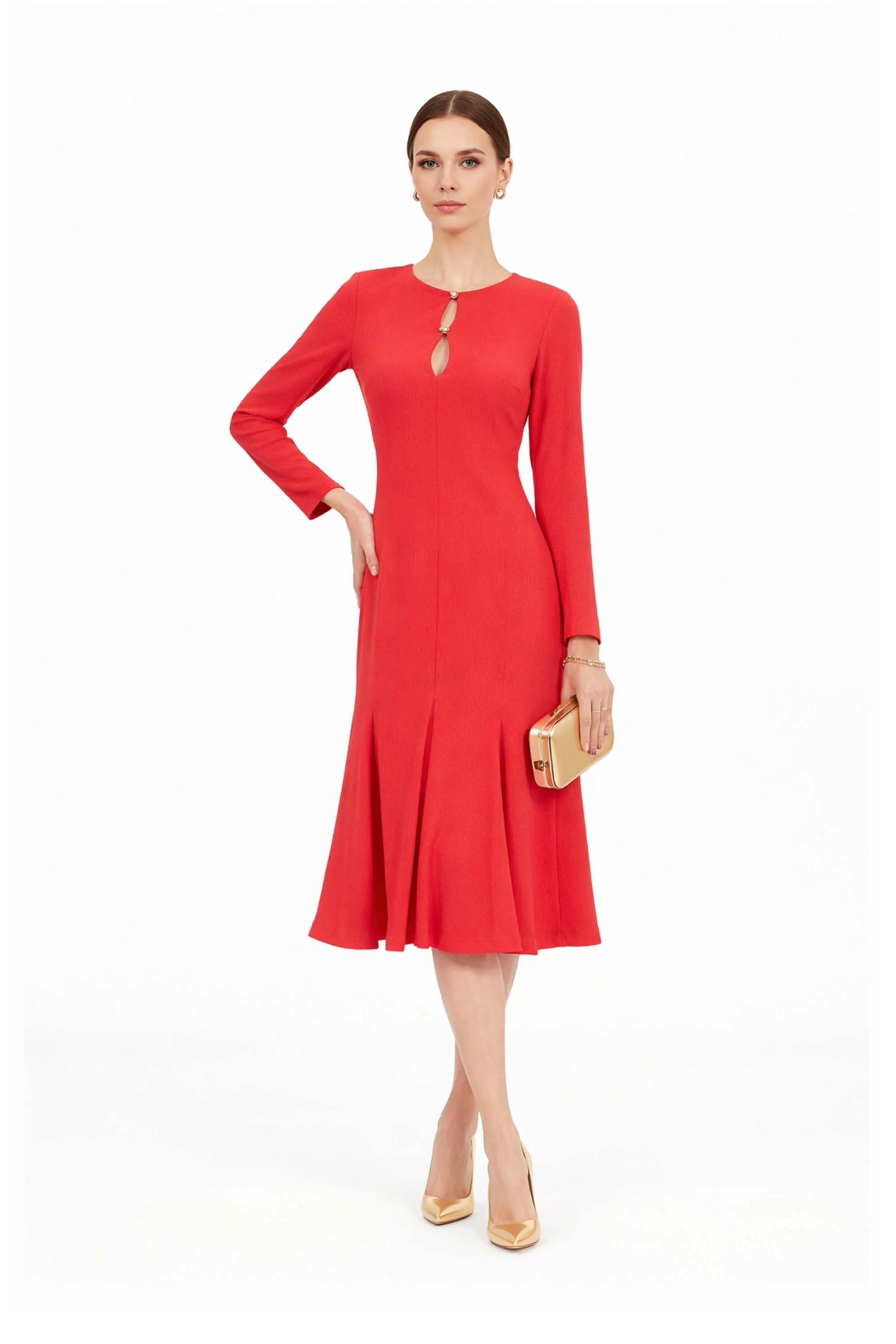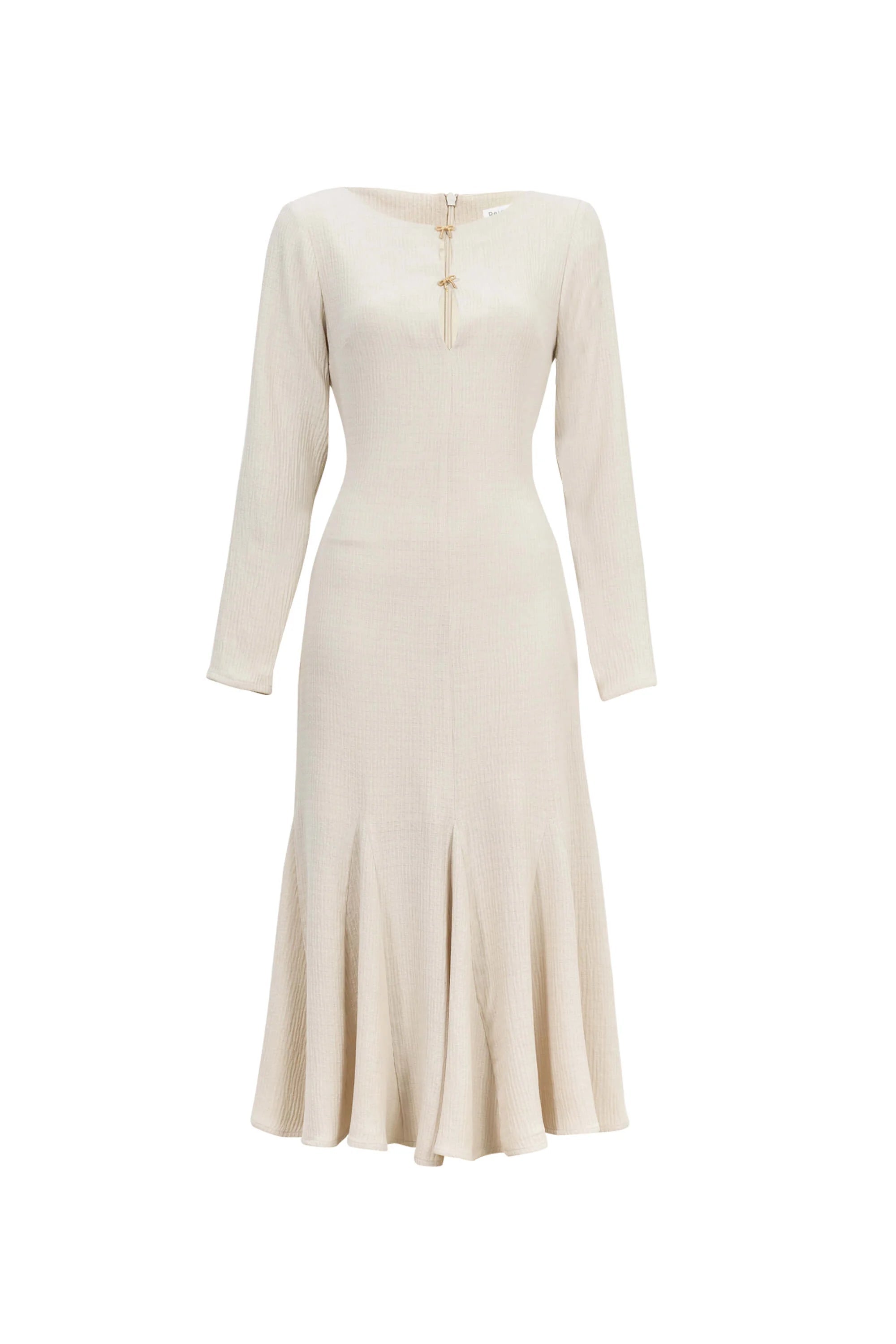 Este vestido destaca por su sofisticada silueta fit-and-flare, diseñada para ceñir el torso con precisión y dar paso a una falda con un vuelo arquitectónico magistral. El punto focal de diseño es su escote redondo con una abertura en lágrima (keyhole) frontal, adornada con dos delicados lazos en contraste que añaden un toque de romanticismo artesanal. Presenta mangas largas de corte limpio que equilibran el volumen de la falda, proyectando una imagen de elegancia minimalista y sobria.