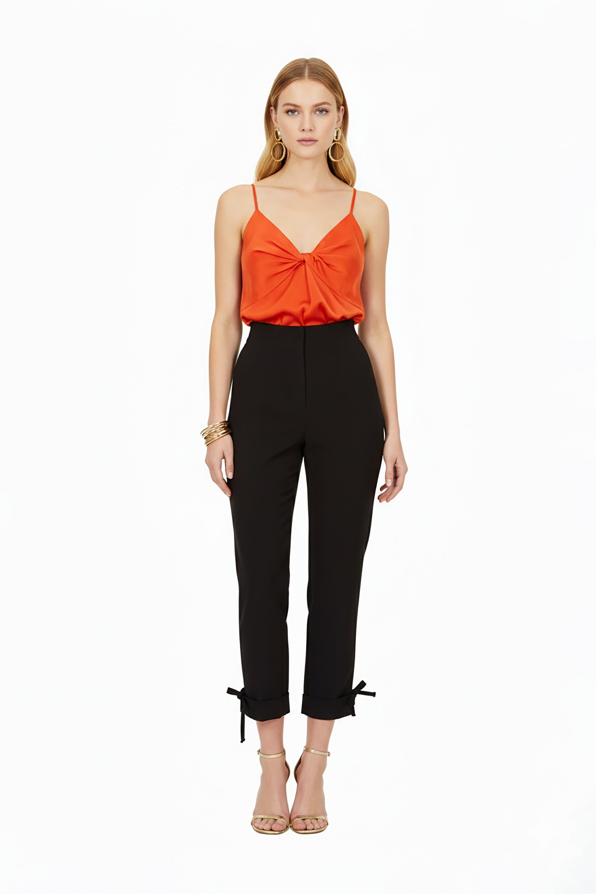 Este top destaca por su seductor escote en V con detalle de nudo central (twisted front), que crea un drapeado artístico y realza el busto con una sofisticación atemporal. El diseño se caracteriza por sus tirantes finos ajustables (spaghetti straps), que aportan una ligereza etérea y permiten personalizar el ajuste según la silueta. Su tono sólido y profundo actúa como una declaración de lujo discreto, ideal para la mujer que busca piezas clásicas con un giro contemporáneo.