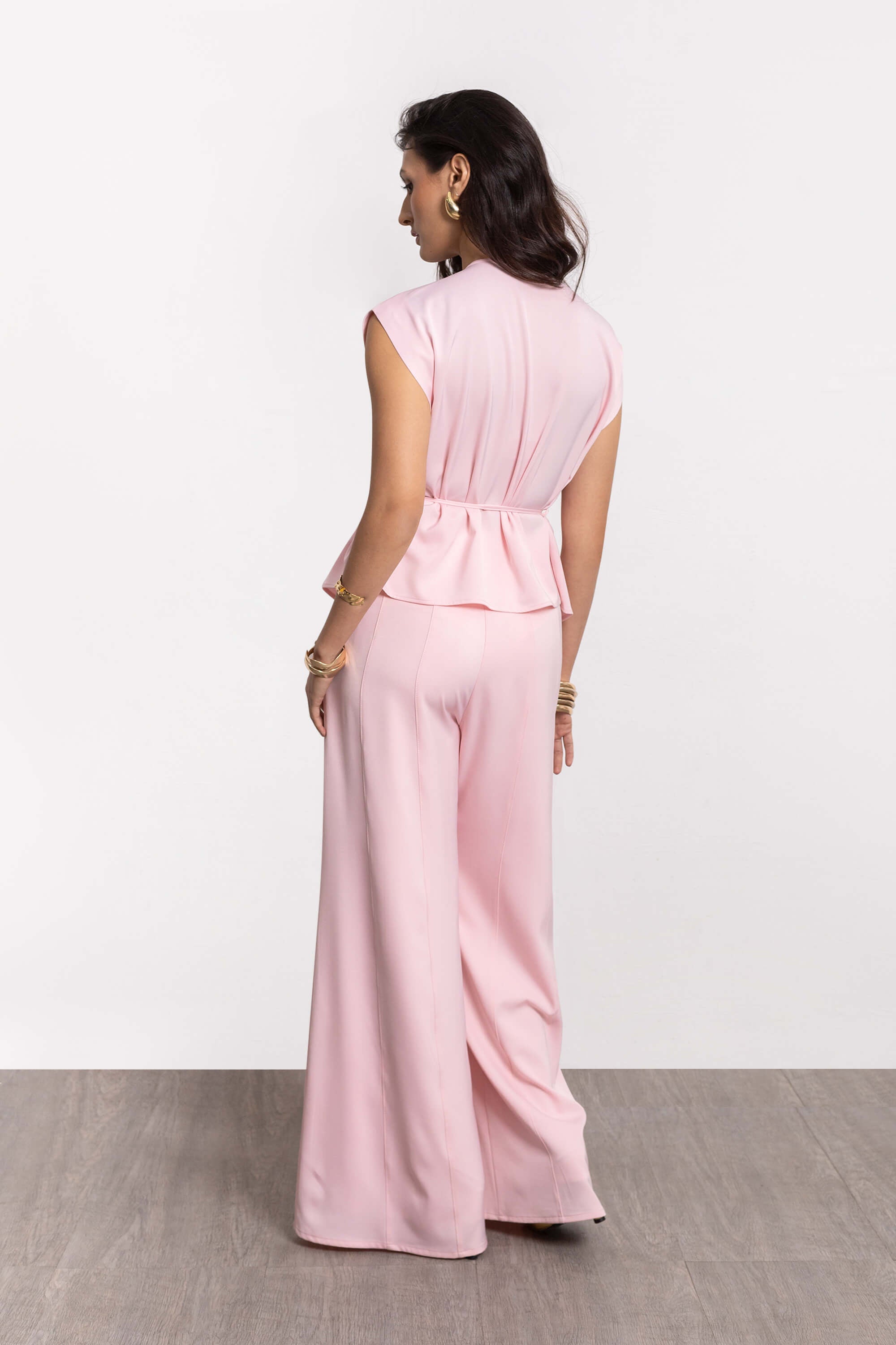 La pieza está elaborada en una mezcla técnica premium de 88% Poliéster y 12% Spandex. Esta composición ha sido seleccionada por su excepcional capacidad para mantener la estructura de la prenda y su resistencia a las arrugas, mientras que el alto porcentaje de elastano garantiza una libertad de movimiento absoluta. El textil ofrece una caída fluida y pesada, asegurando que el tono rosa pastel conserve su suavidad y opacidad bajo cualquier iluminación, proporcionando un tacto sedoso sobre la piel.