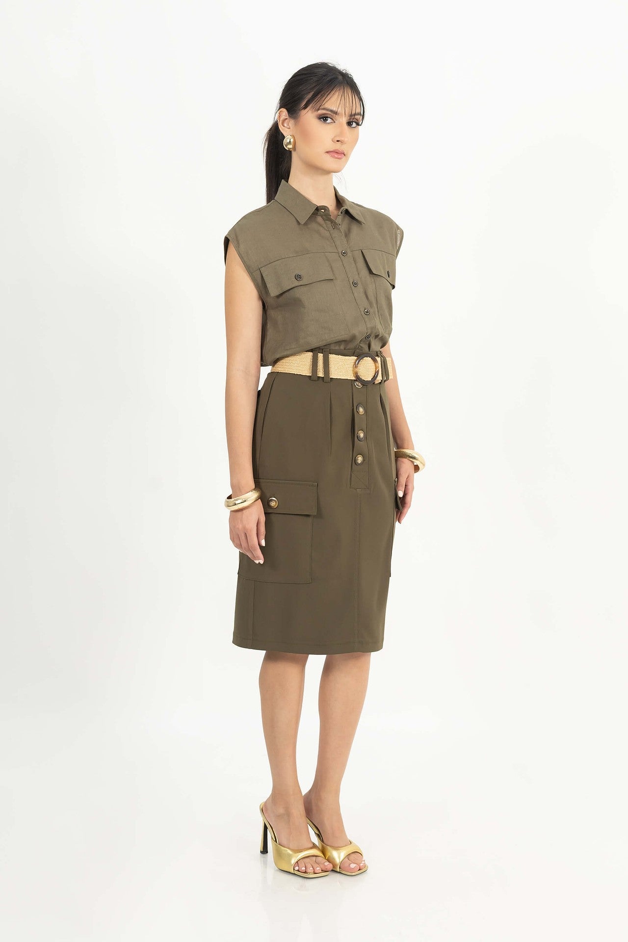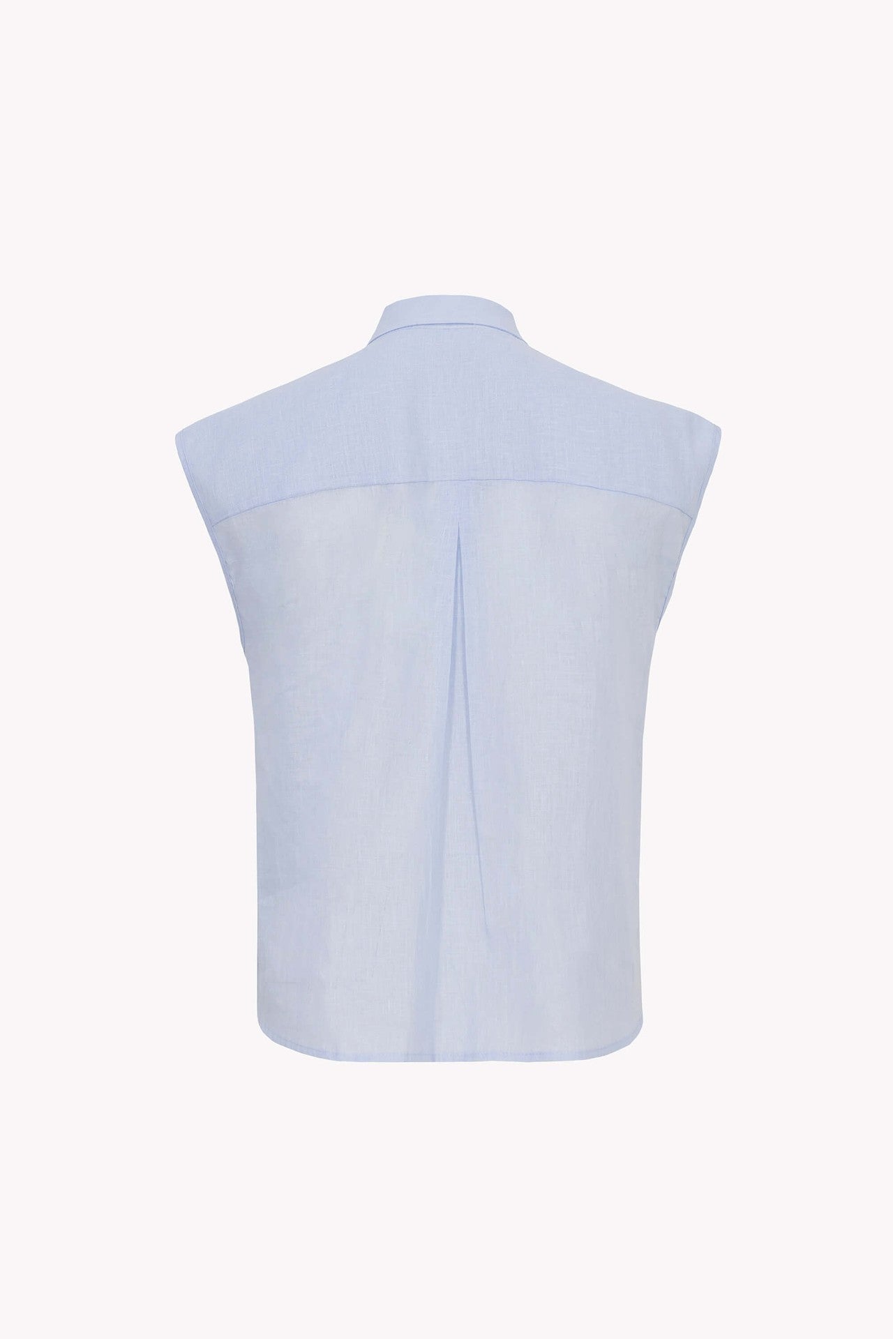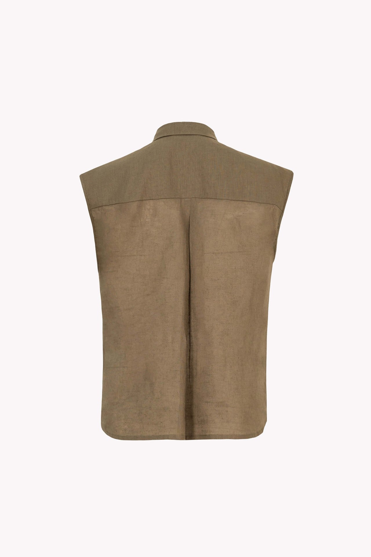Esta camisa destaca por su clásico cuello de solapa y botonadura frontal completa, que aporta una línea de estructura impecable con un aire moderno y funcional. El punto focal son sus dos bolsillos de parche con solapa y cierre de botón situados estratégicamente en el pecho, que añaden una dimensión de diseño utilitario y carácter visual a la prenda. Se caracteriza por su diseño sin mangas y hombros de corte limpio, proyectando una silueta minimalista y fresca.
