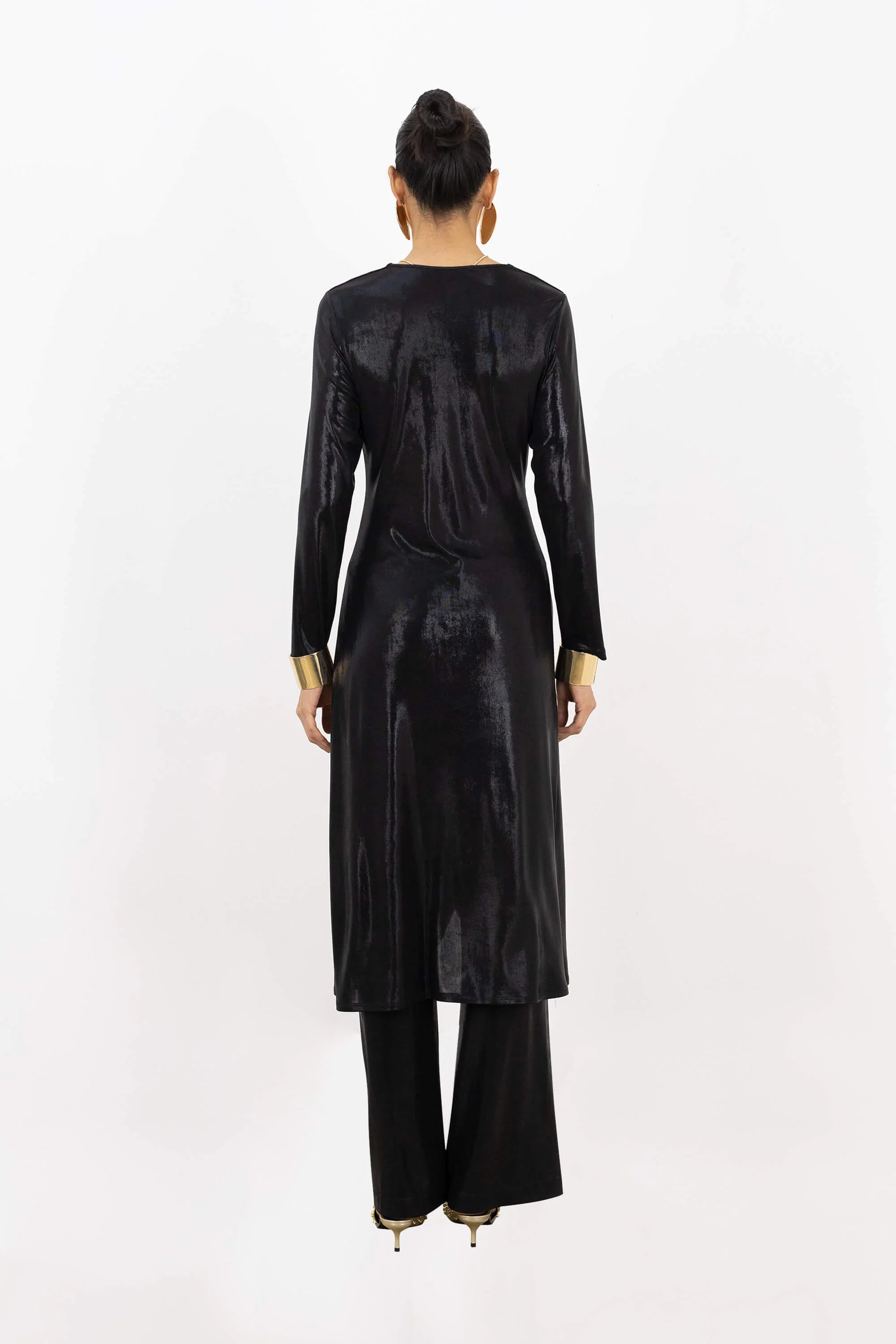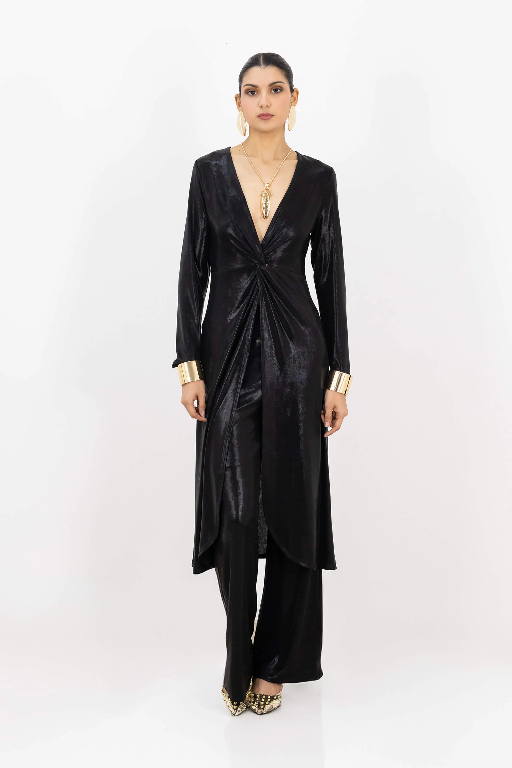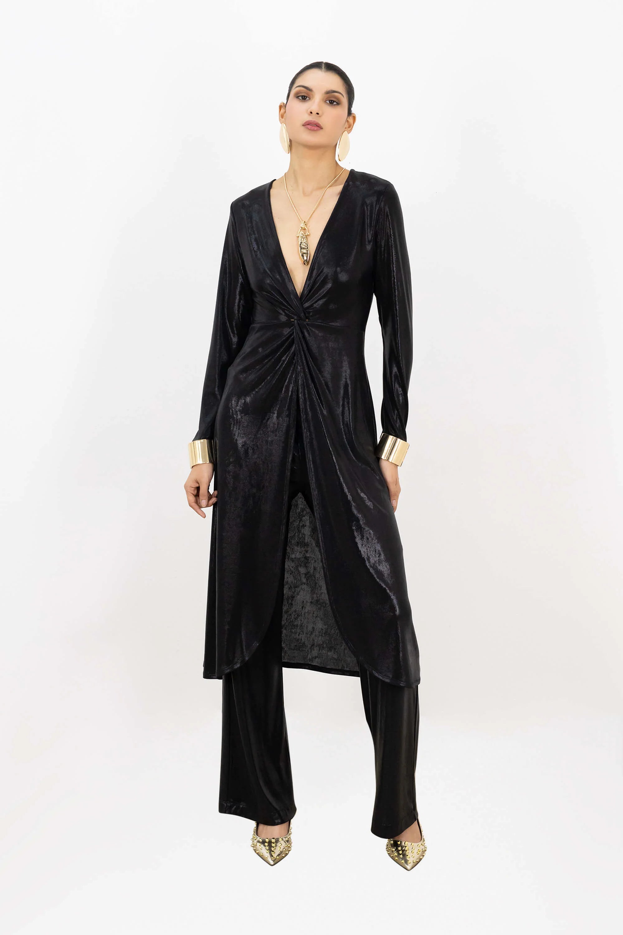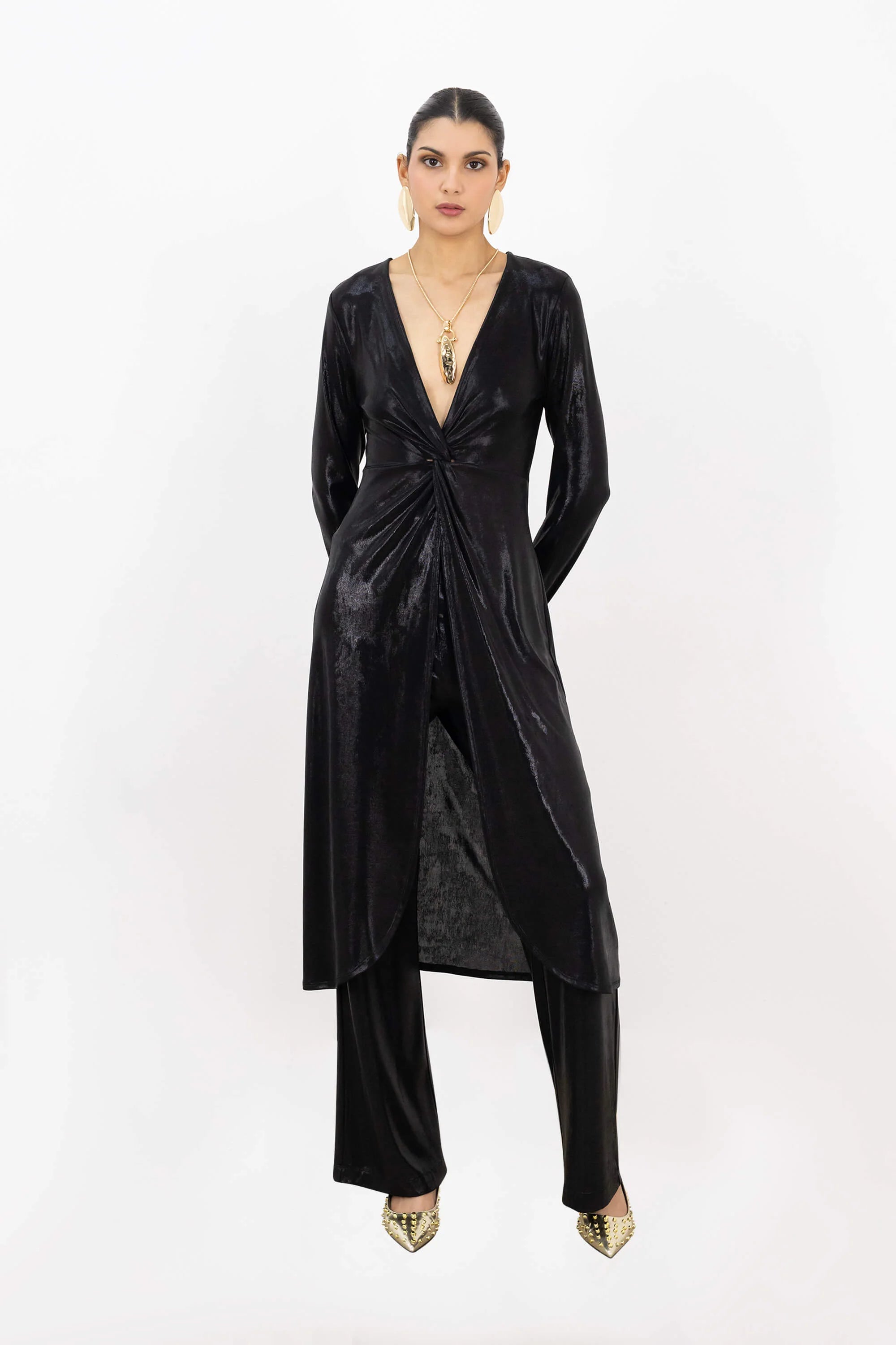 Confeccionado en un profundo tono negro, esta pieza es tan versátil como refinada, perfecta para llevar en reuniones formales.