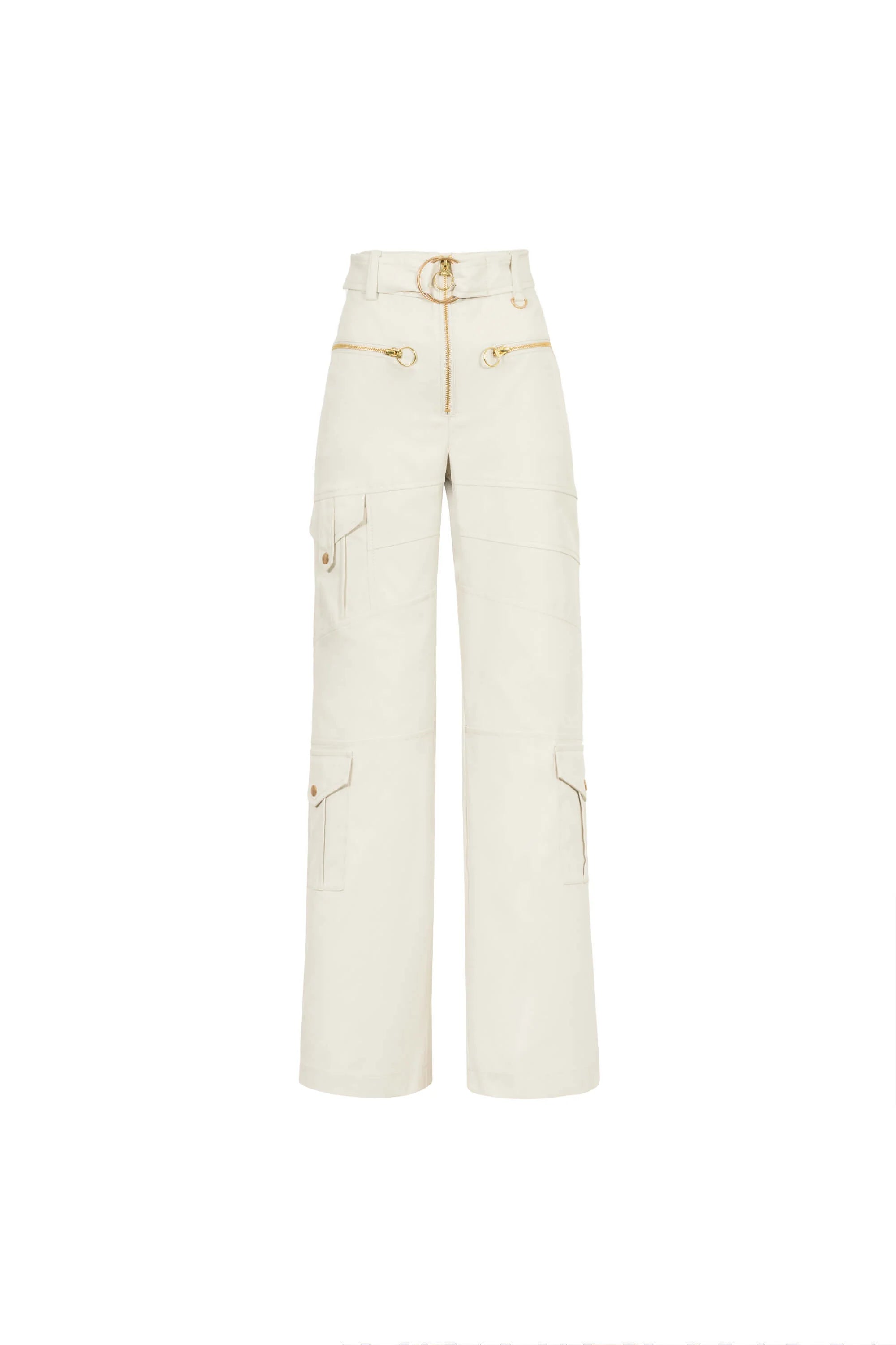 Pantalón con cortes, bolsas de carteras y detalles metálicos.