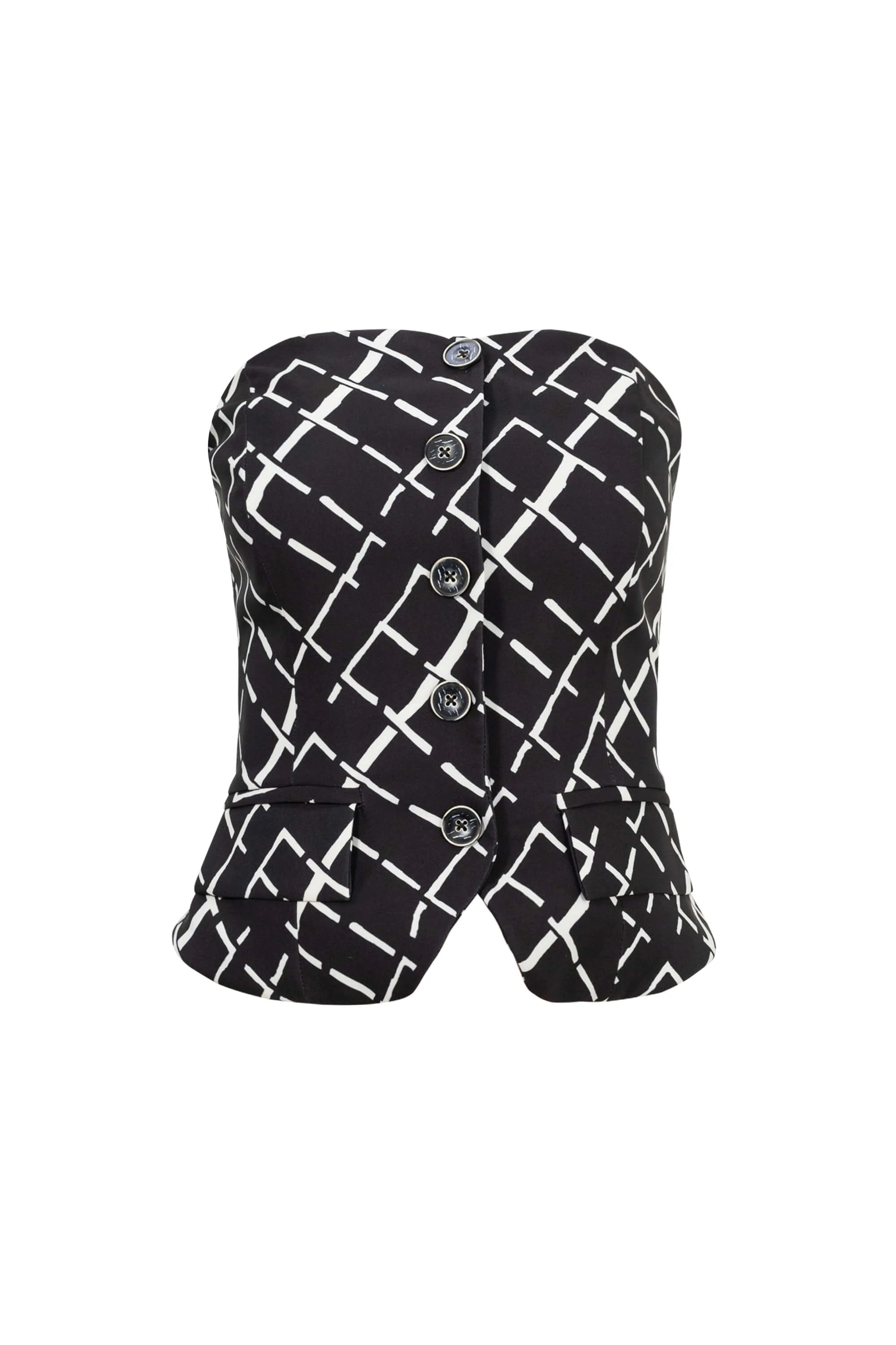 El Saco strapless con botones y carteras de Reina Díaz reinterpreta la sastrería femenina con un enfoque moderno y audaz. Su diseño estructurado sin tirantes realza la silueta con precisión, mientras que la botonadura frontal y las carteras decorativas aportan equilibrio visual. Confeccionado en tela de alta calidad con estampado geométrico, esta pieza es ideal para crear conjuntos elegantes y vanguardistas. Una prenda icónica que expresa sofisticación y seguridad.