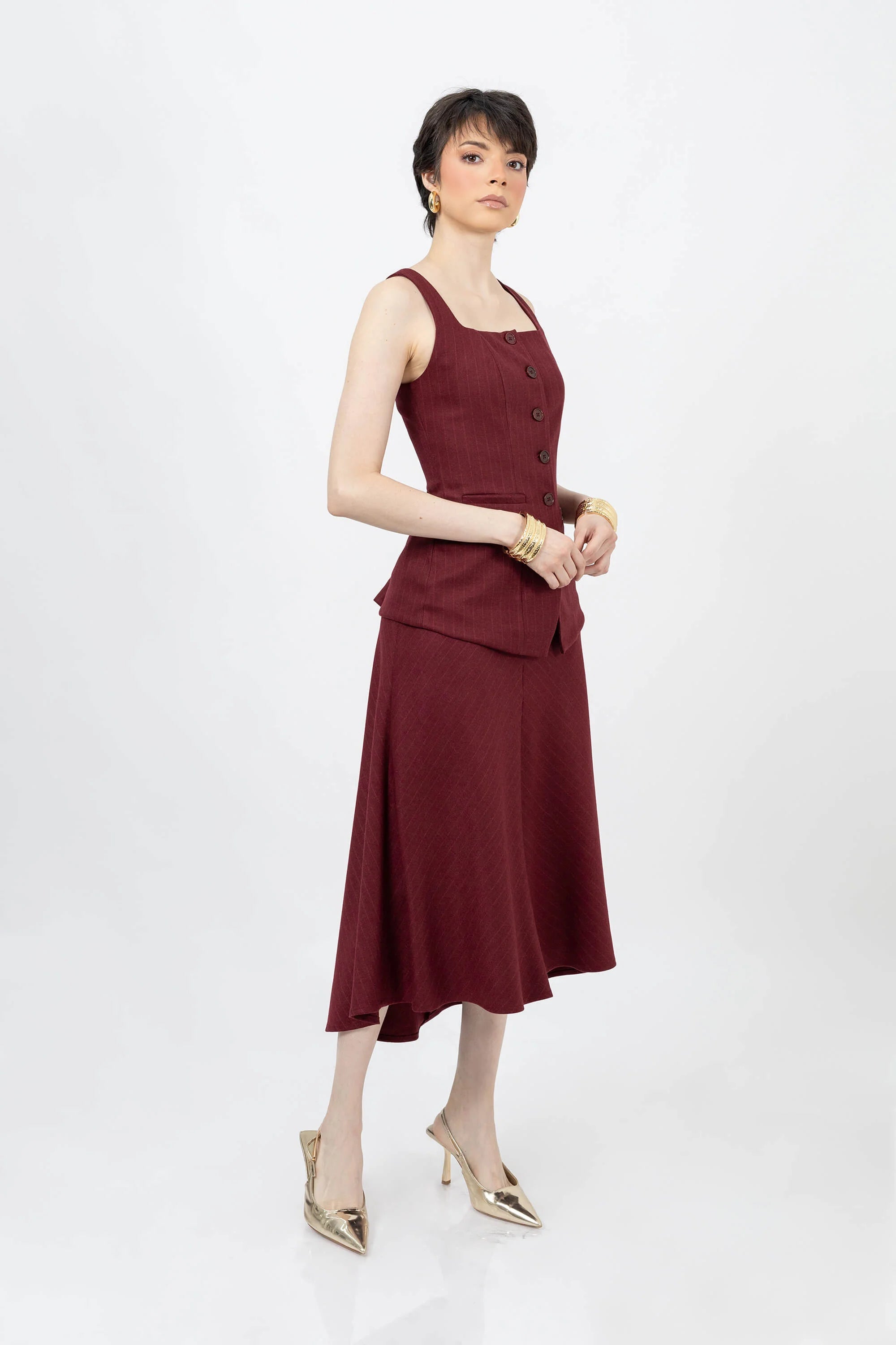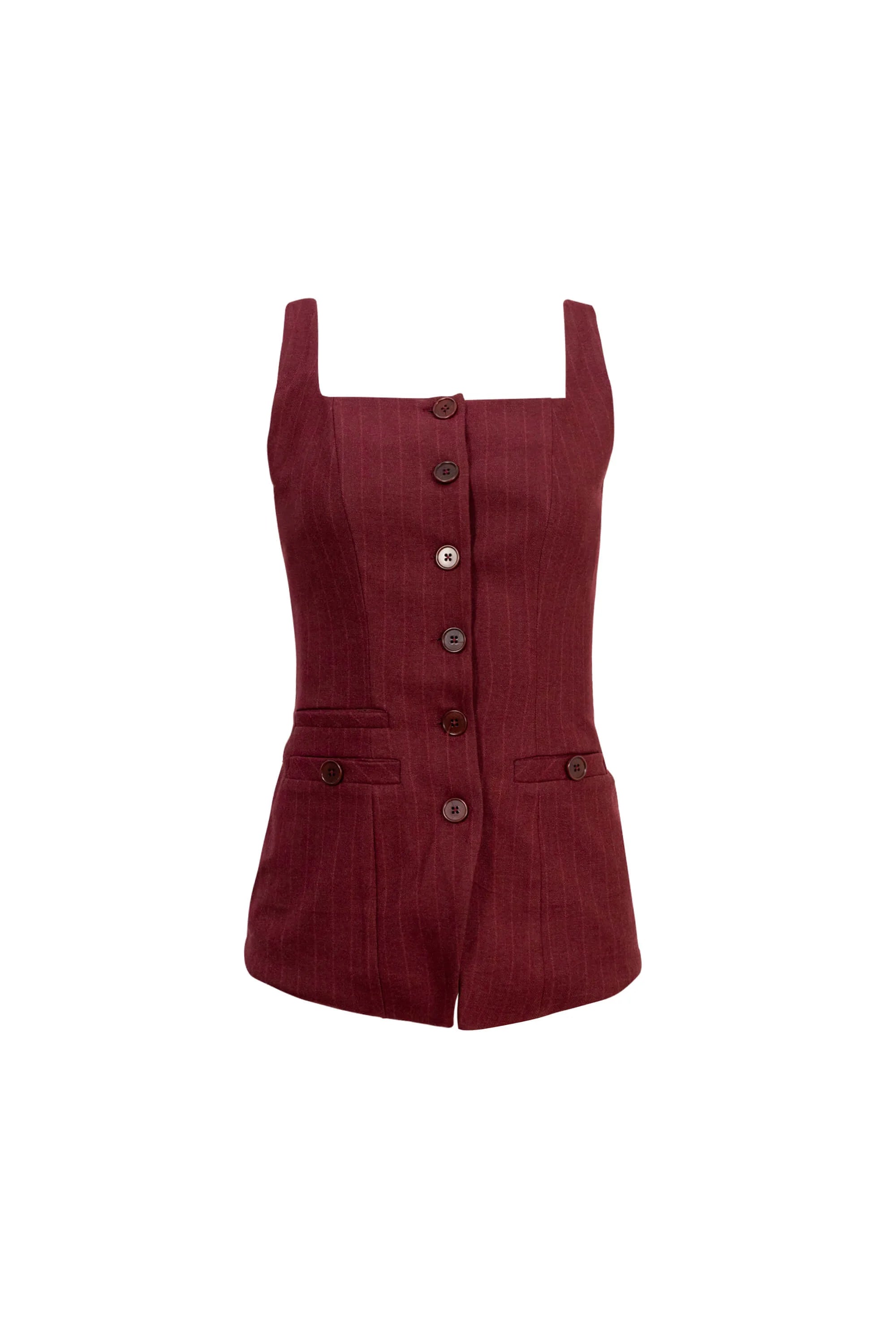 El Saco de tirantes con escote cuadrado y botones al frente de Reina Díaz es una reinterpretación moderna del tailoring femenino. Su silueta estructurada y el escote geométrico realzan la figura con elegancia y precisión. Los botones frontales y bolsillos simulados añaden un toque clásico, mientras que el tejido con textura sutil aporta profundidad y distinción. Una prenda versátil que equilibra la feminidad con la fuerza del diseño contemporáneo.