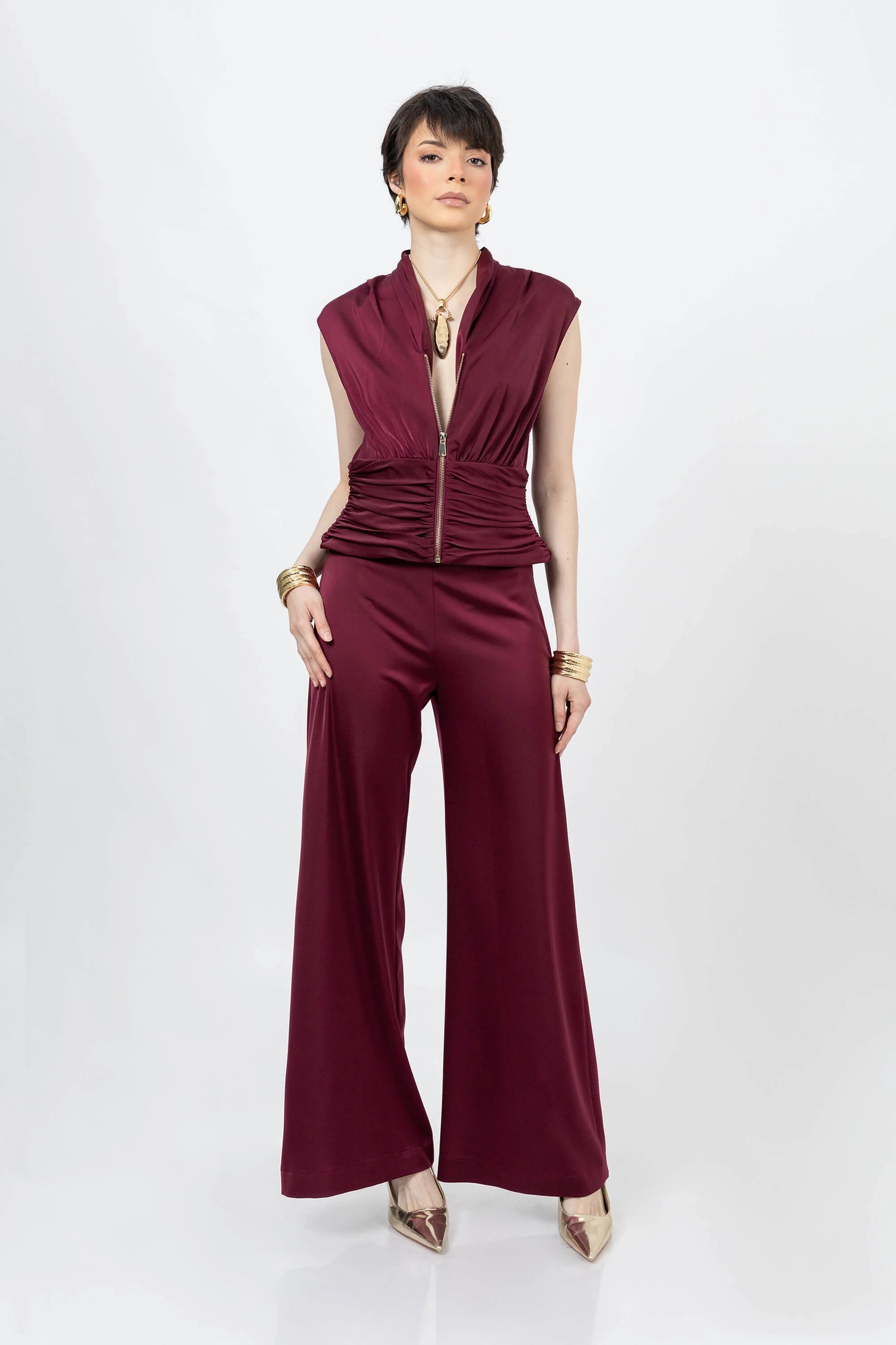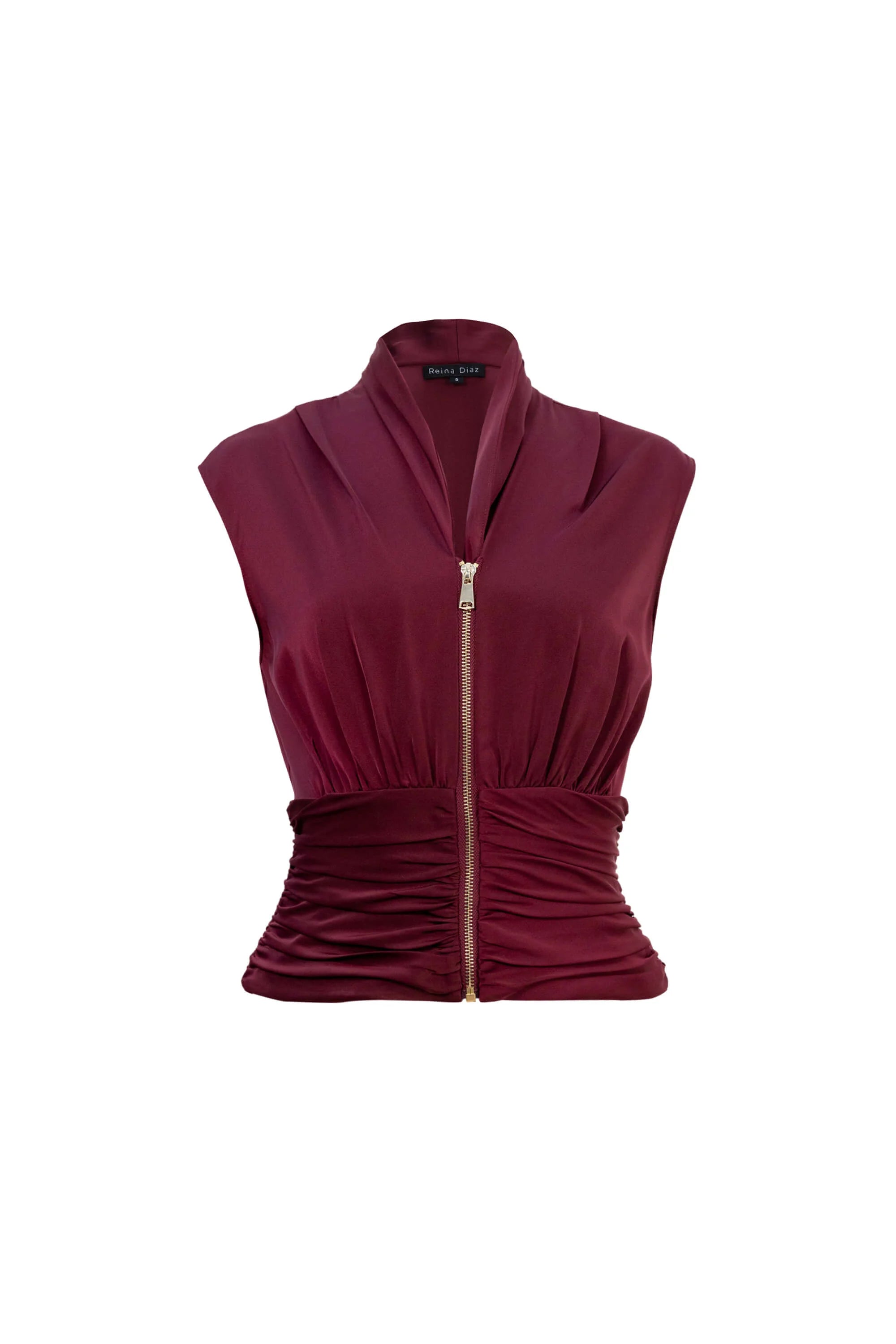 El Saco sisa pasada con peto drapeado de Reina Díaz redefine la sofisticación con un enfoque minimalista y contemporáneo. Su silueta sin mangas en tejido satinado resalta por el efecto drapeado en el peto y la cintura, creando una figura elegante y femenina. El cierre frontal metálico aporta modernidad y contraste, mientras que el diseño estructurado permite combinarlo con pantalones de vestir o faldas midi para un look refinado y versátil.