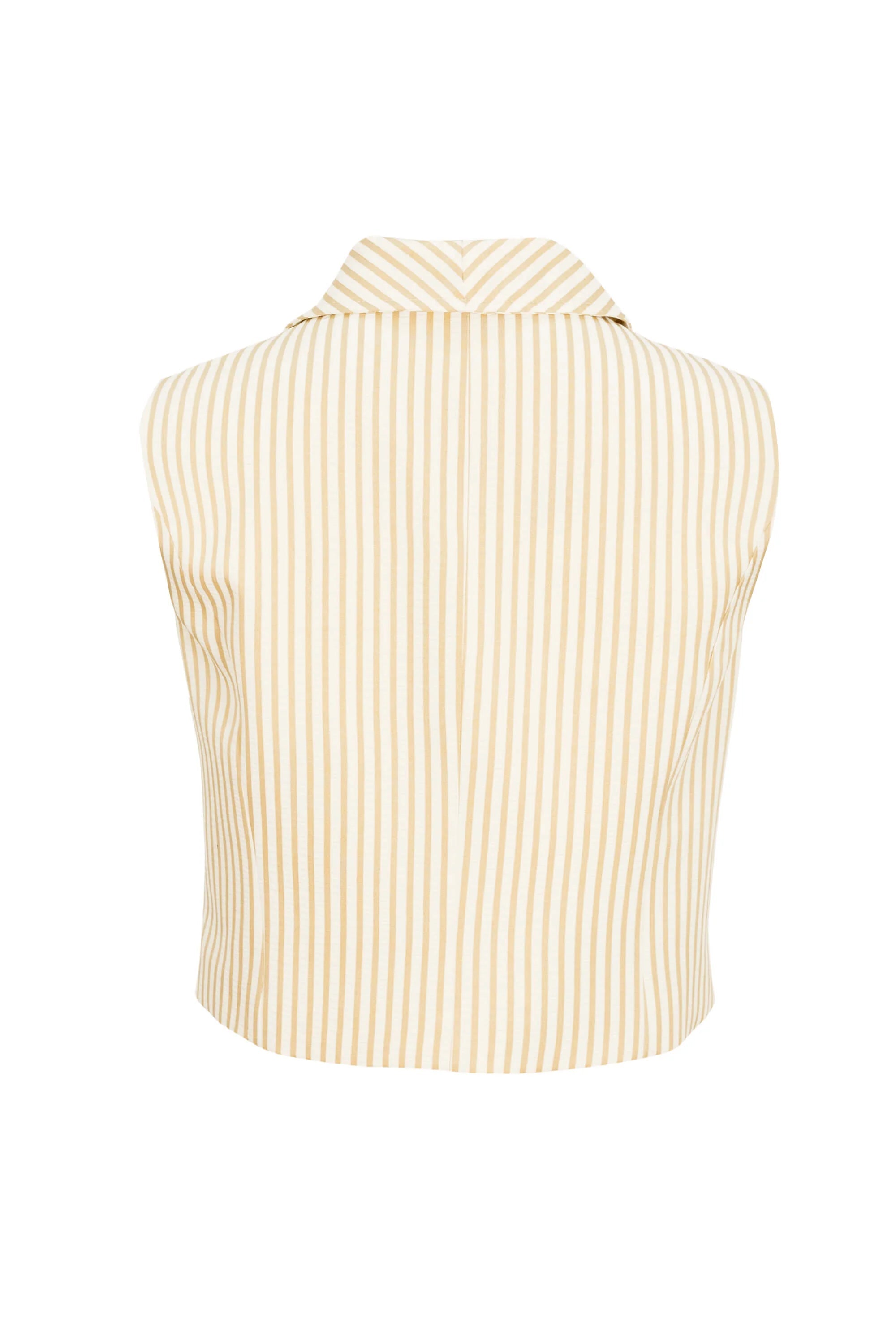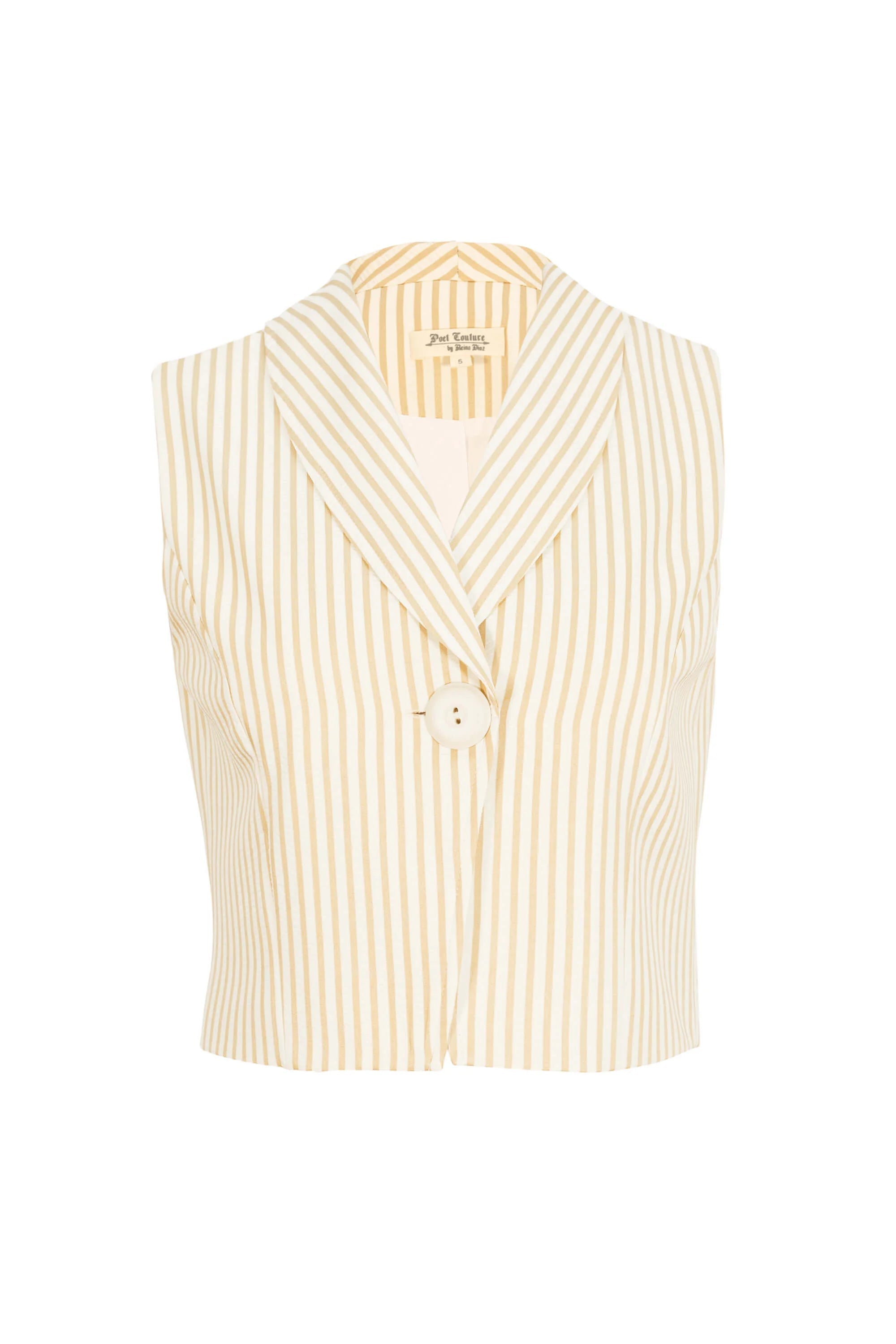El saco corto sin manga con cuello de Poet Couture redefine la elegancia contemporánea con un diseño estructurado y ligero. Confeccionado en un tejido suave con finas rayas verticales, este modelo destaca por su silueta moderna y su versatilidad para combinar con blusas, tops o pantalones de talle alto. Su cuello sastre y botón frontal aportan un toque refinado ideal para looks de oficina o conjuntos casuales con estilo.