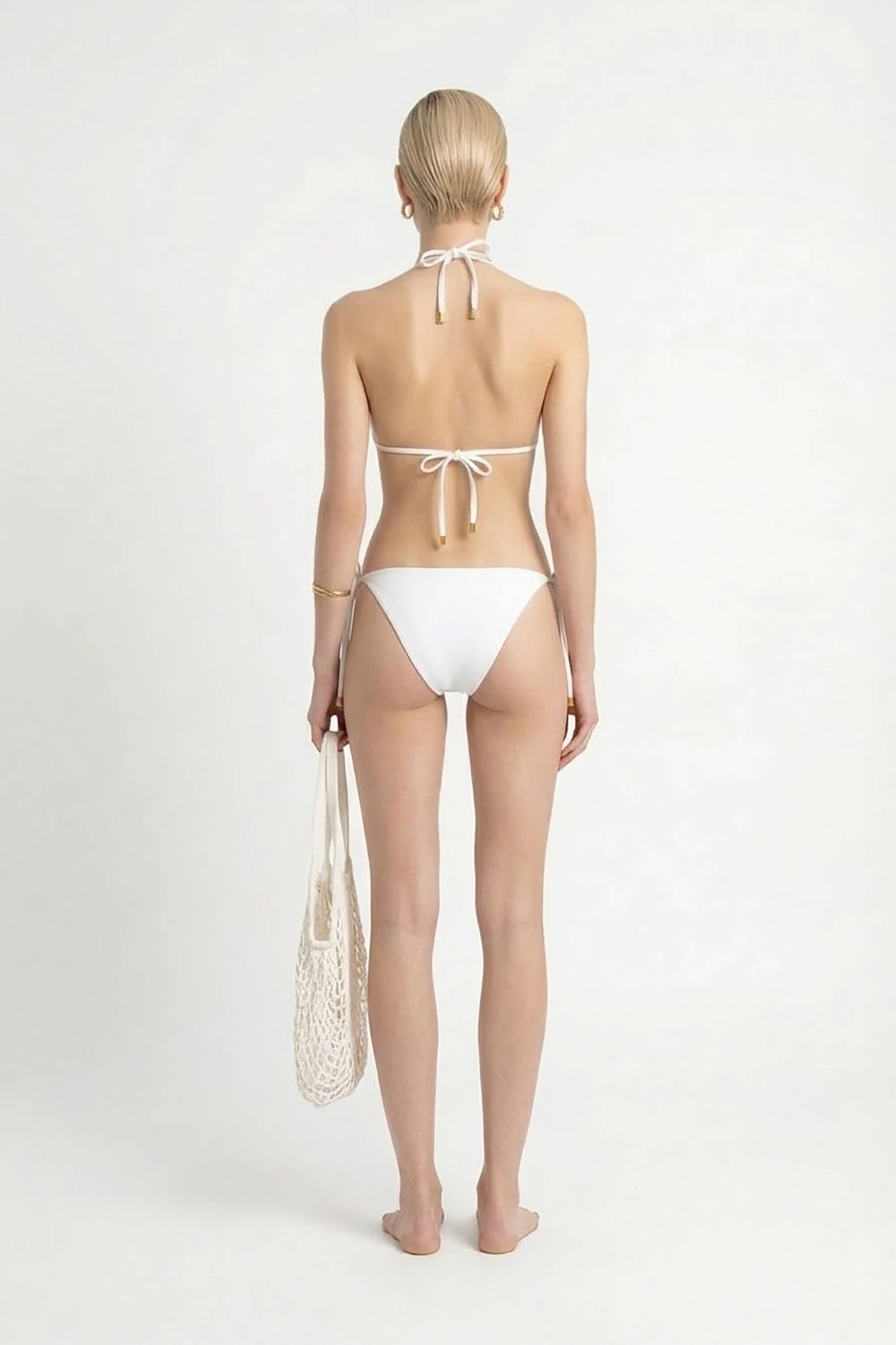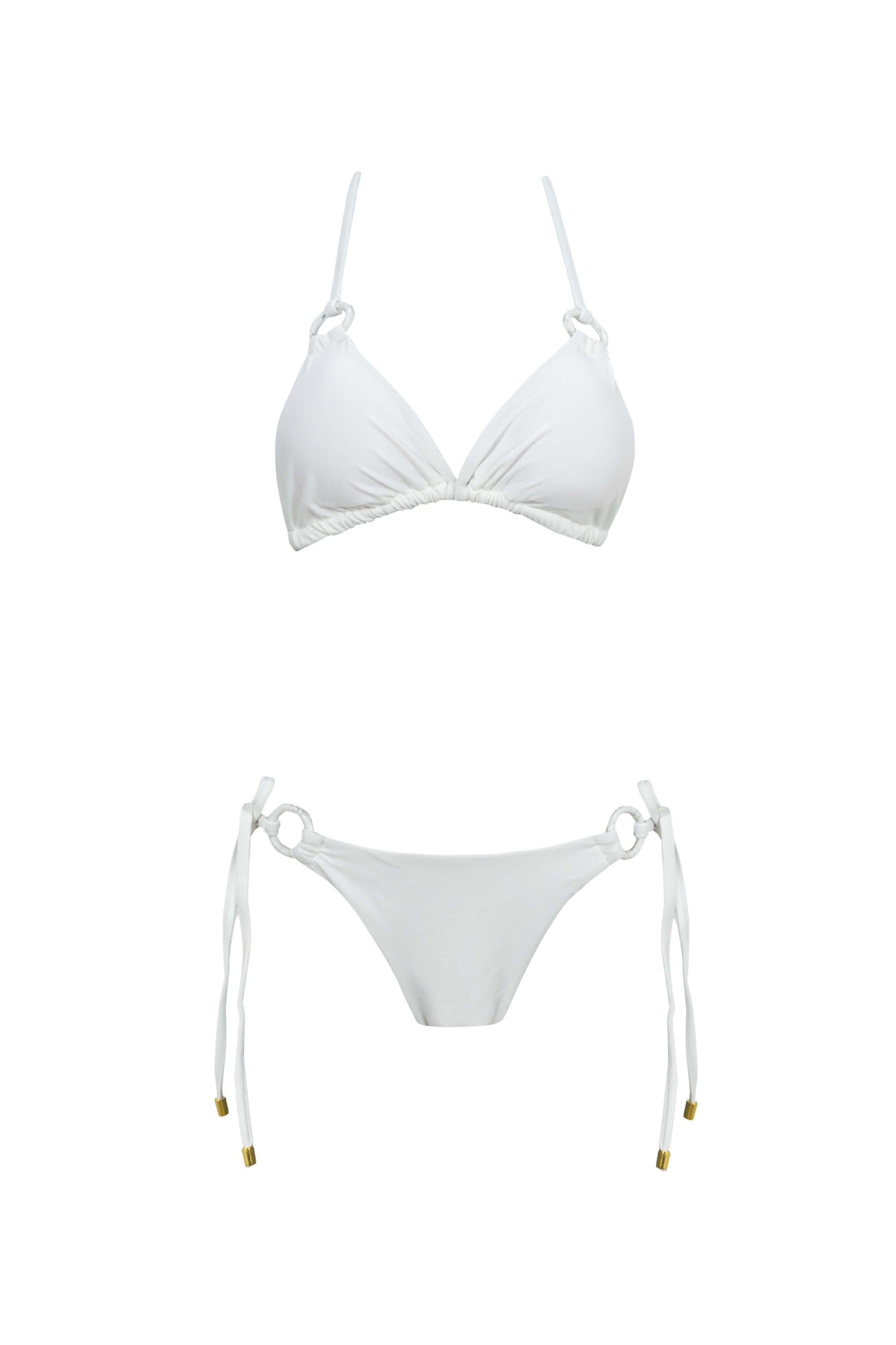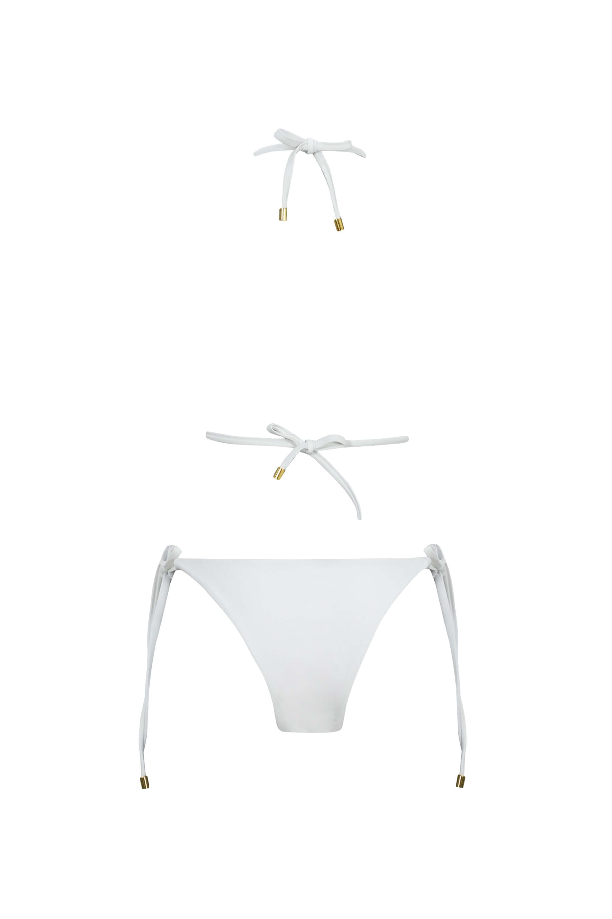 Este conjunto de bikini representa la elegancia purista y el lujo minimalista. El top presenta un corte de triángulo clásico que ofrece una cobertura ajustable y un escote limpio. La braguita es de estilo low-rise (tiro bajo) con lazadas laterales, permitiendo un ajuste perfecto a la cadera. Su color blanco óptico proyecta una imagen de frescura, sofisticación y es ideal para resaltar el bronceado.