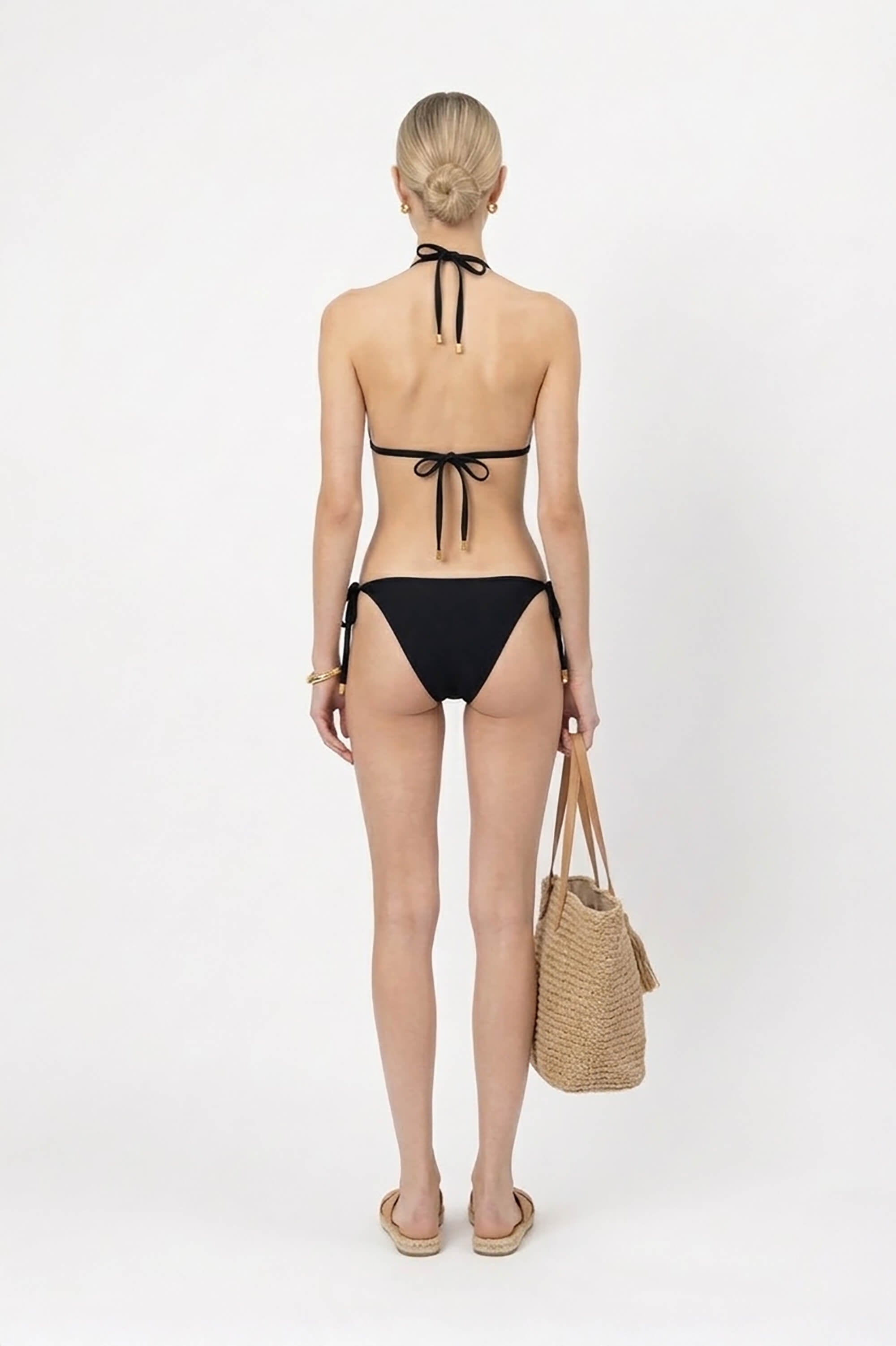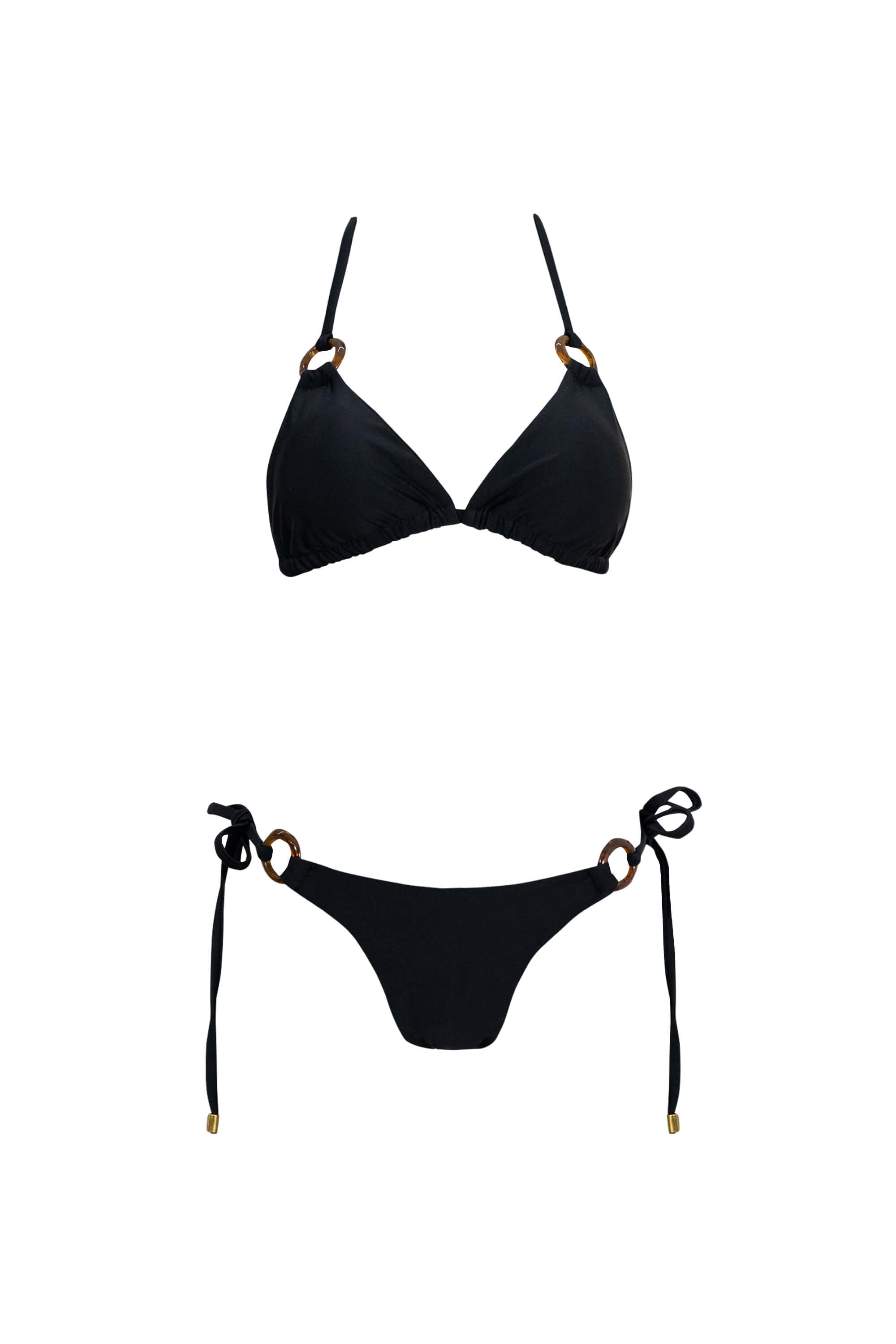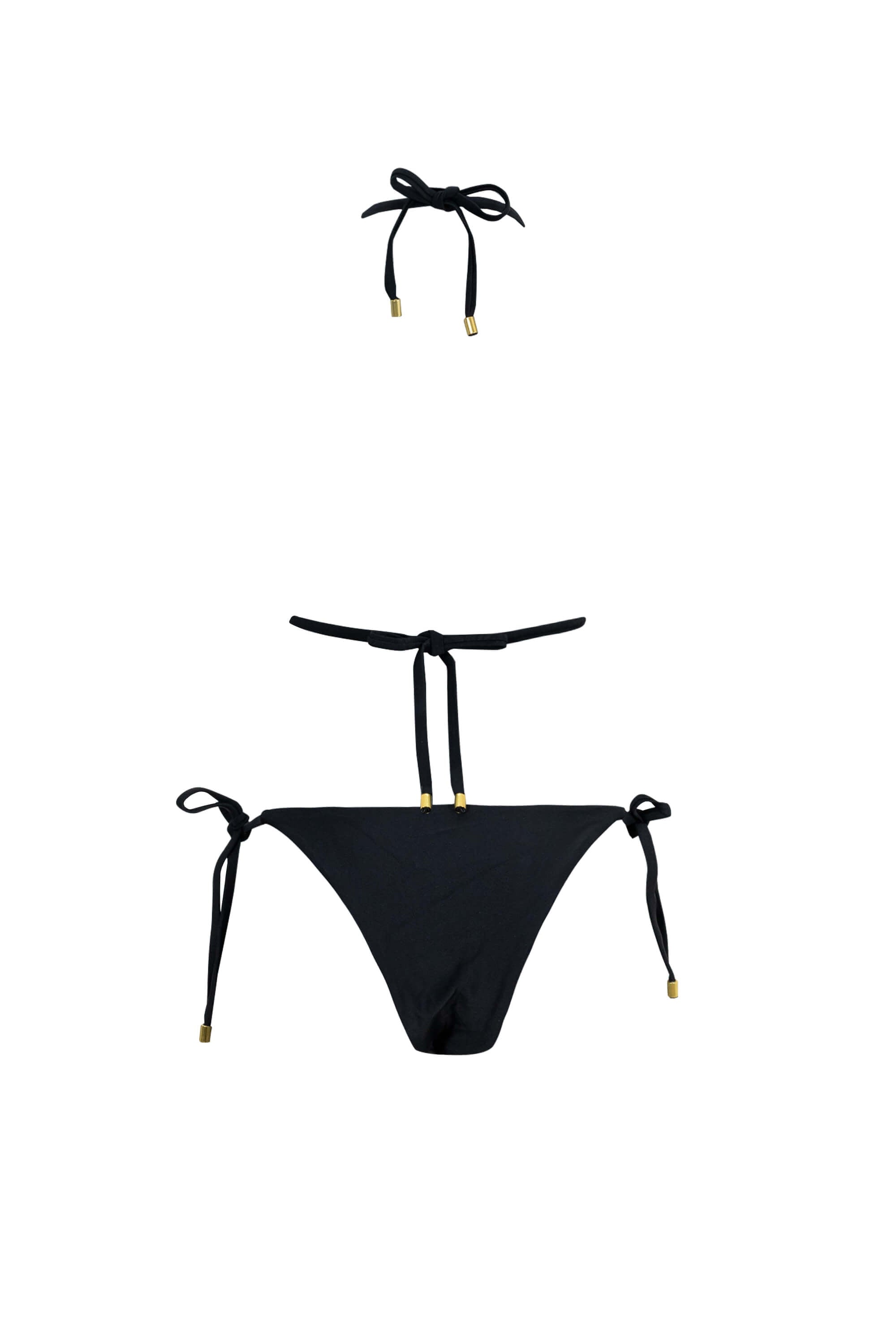 El elemento distintivo de este modelo son sus herrajes circulares texturizados en acabado marmoleado. Estos detalles están estratégicamente situados en la unión de los tirantes del top y en los laterales de la braguita, funcionando como piezas de arte integradas que elevan el diseño básico. Además, los cordones están rematados con terminales metálicos dorados que aportan un sutil contraste de lujo y un acabado premium.