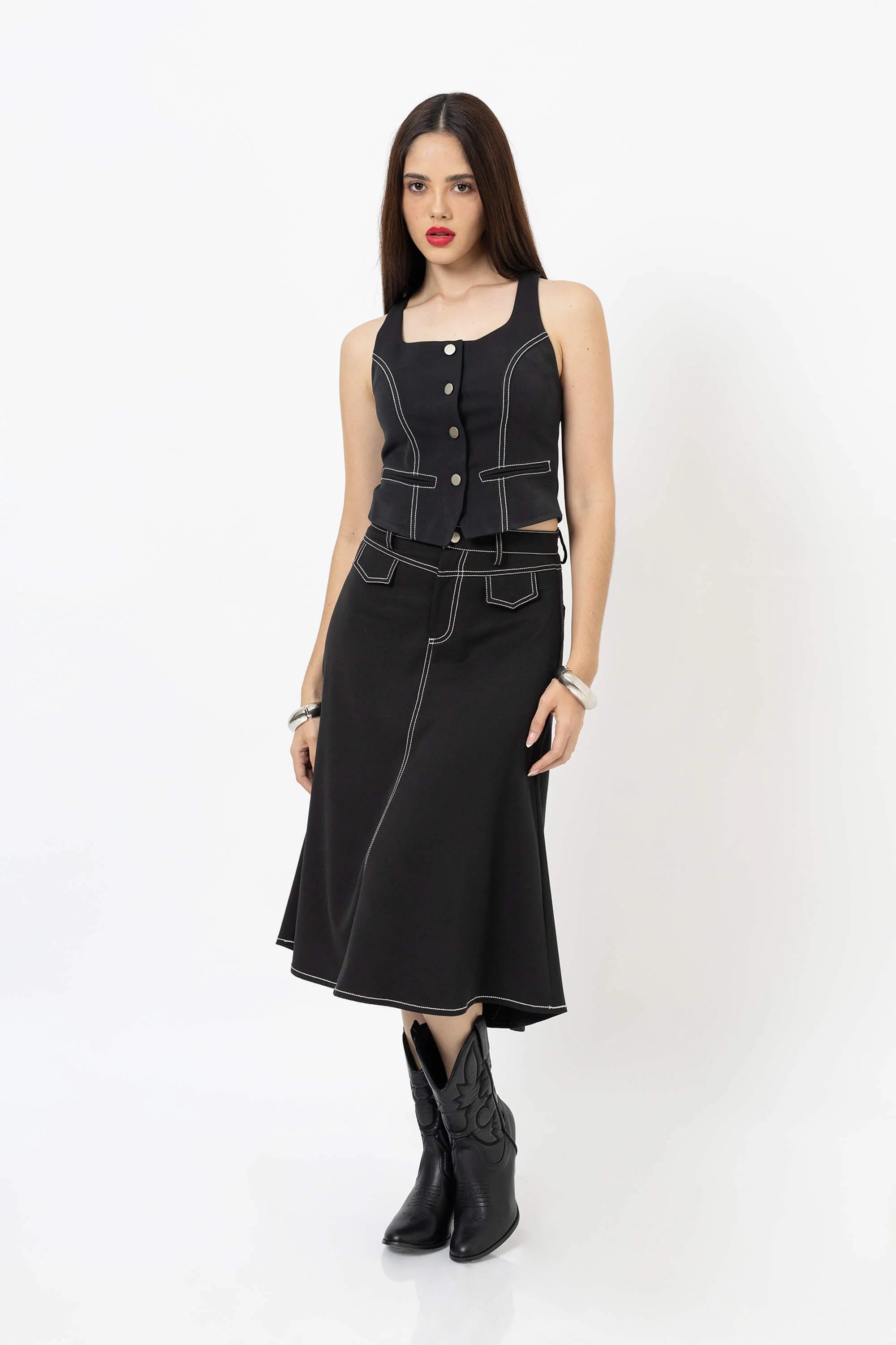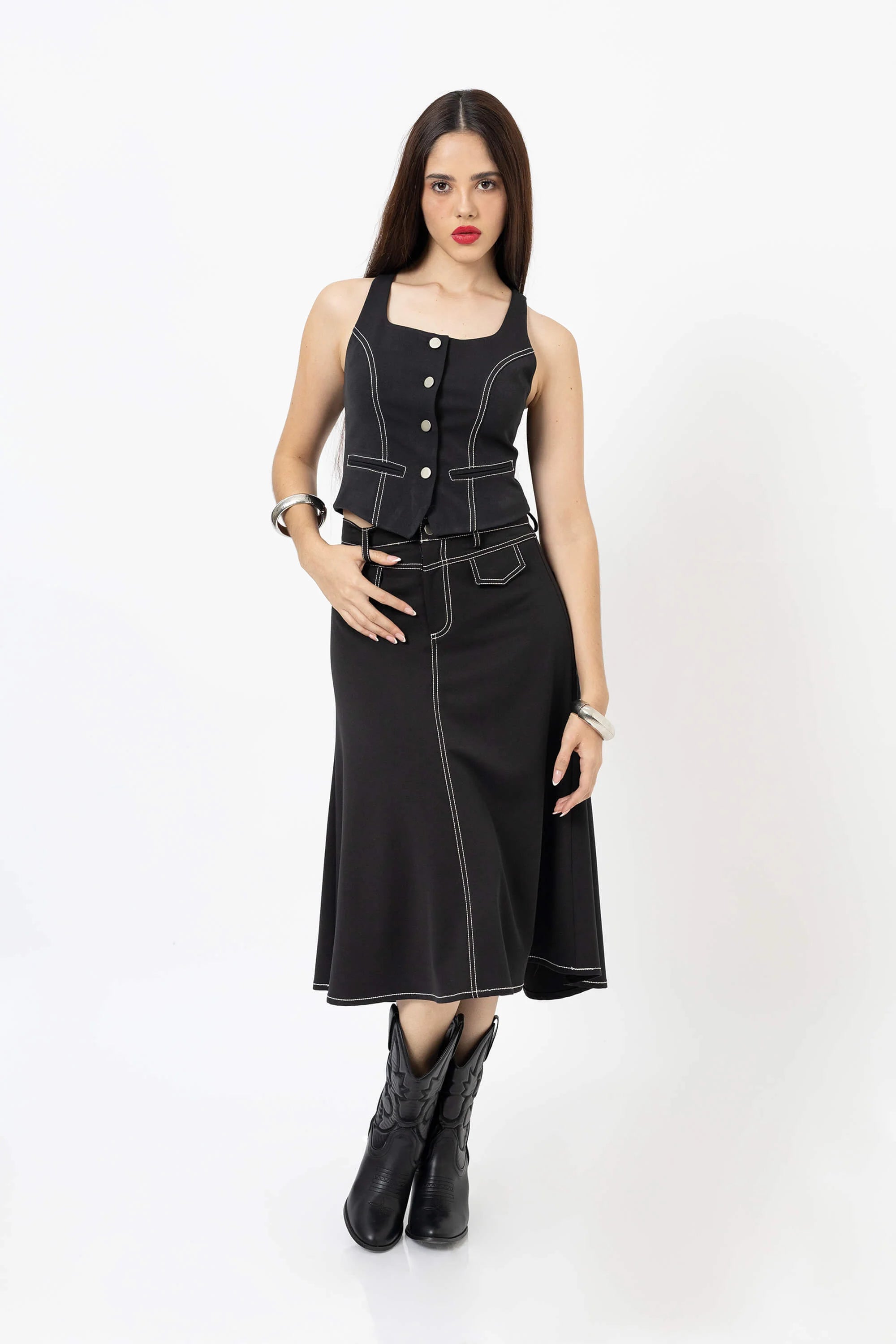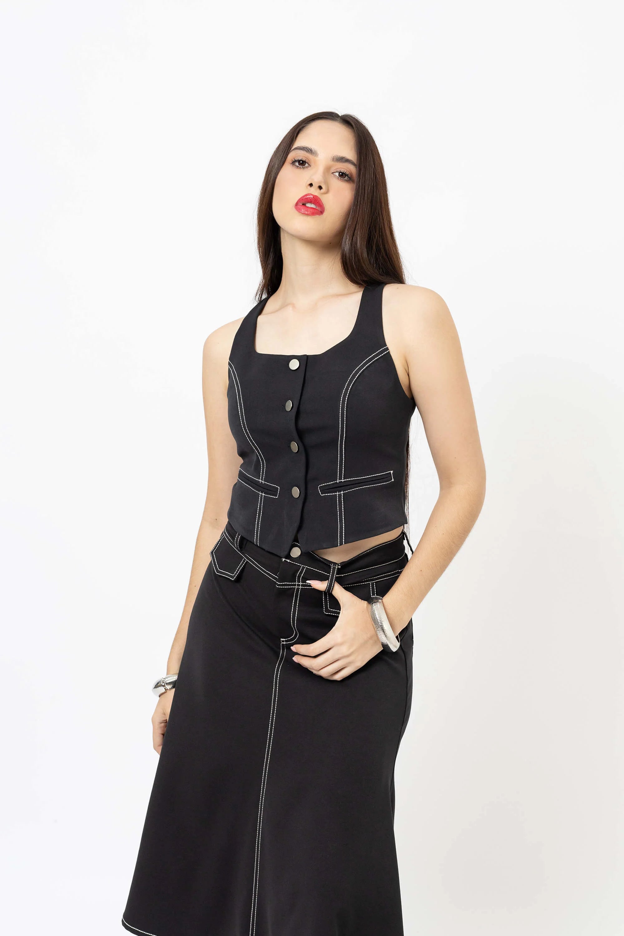 El top escote cuadrado con bies tipo chaleco es una prenda que reinventa la sastrería femenina con un aire moderno y versátil. Inspirado en la elegancia atemporal de los chalecos clásicos, este diseño destaca por su escote estructurado y líneas con bies contrastante, que estilizan la figura y le otorgan un carácter sofisticado.