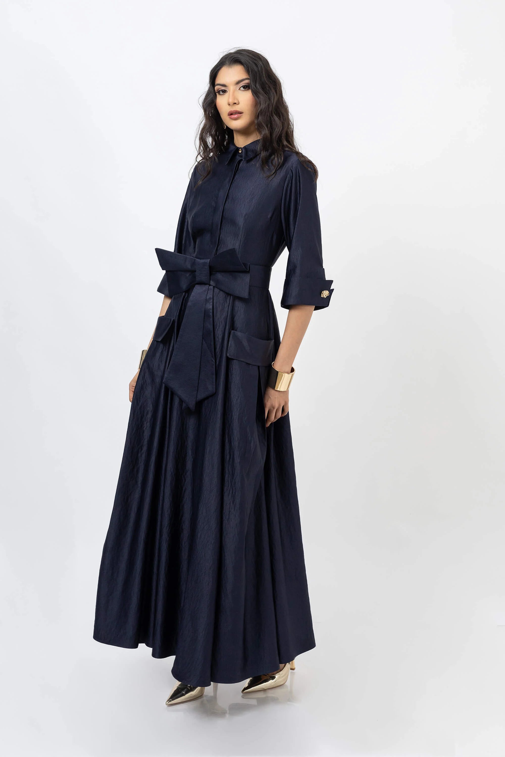 Este vestido camisero de longitud maxi destaca por su impecable confección y un sofisticado acabado texturizado en color azul marino profundo. Presenta un cuello camisero clásico, mangas de longitud tres cuartos con puños anchos y una hilera de botones frontales ocultos que mantienen la pureza del diseño. El elemento central es un cinturón integrado de lazo XL que se anuda al frente, creando un drapeado orgánico que define la cintura y aporta un volumen majestuoso a la falda de línea A con bolsillos laterales funcionales.