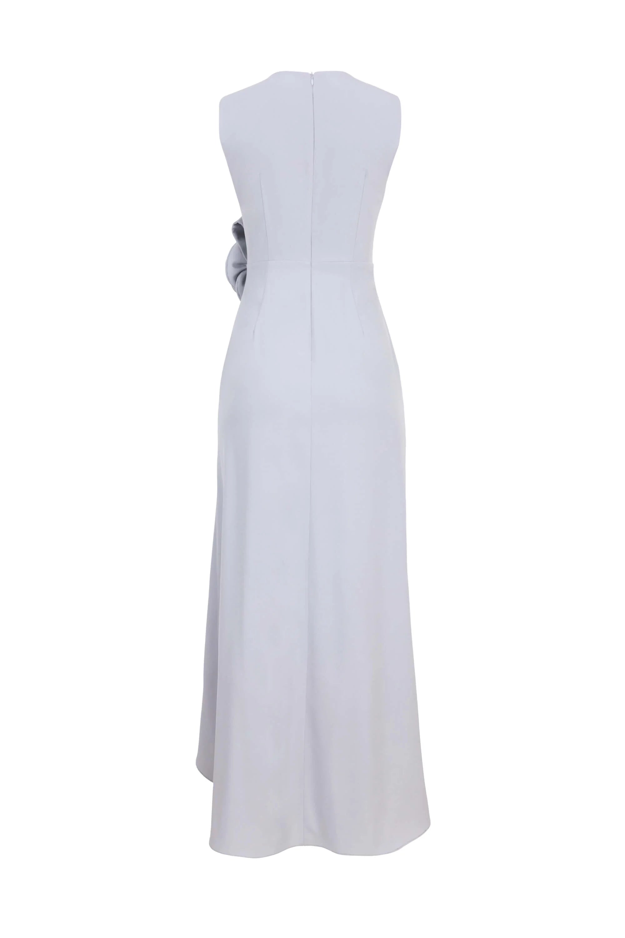 Vestido largo asimétrico con moño estructurado y flor maxi.