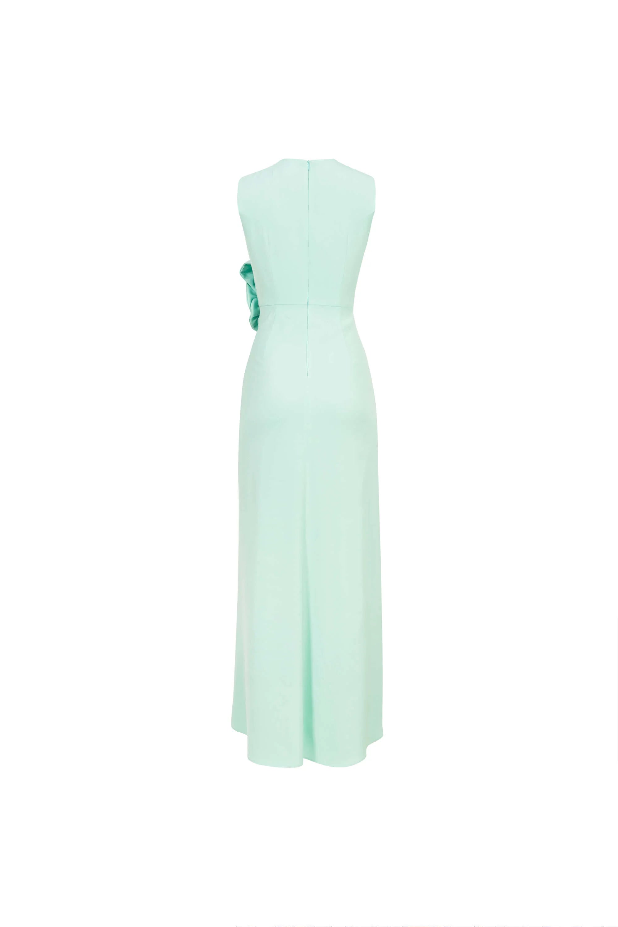 Vestido largo asimétrico con moño estructurado y flor maxi.