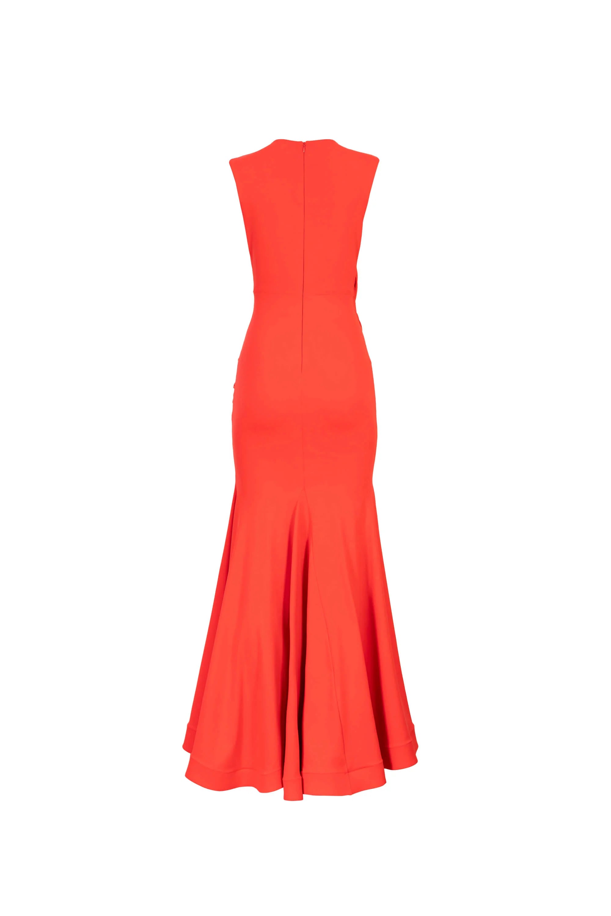 Vestido largo con escote cruzado y detalles en pliegues en color rojo .