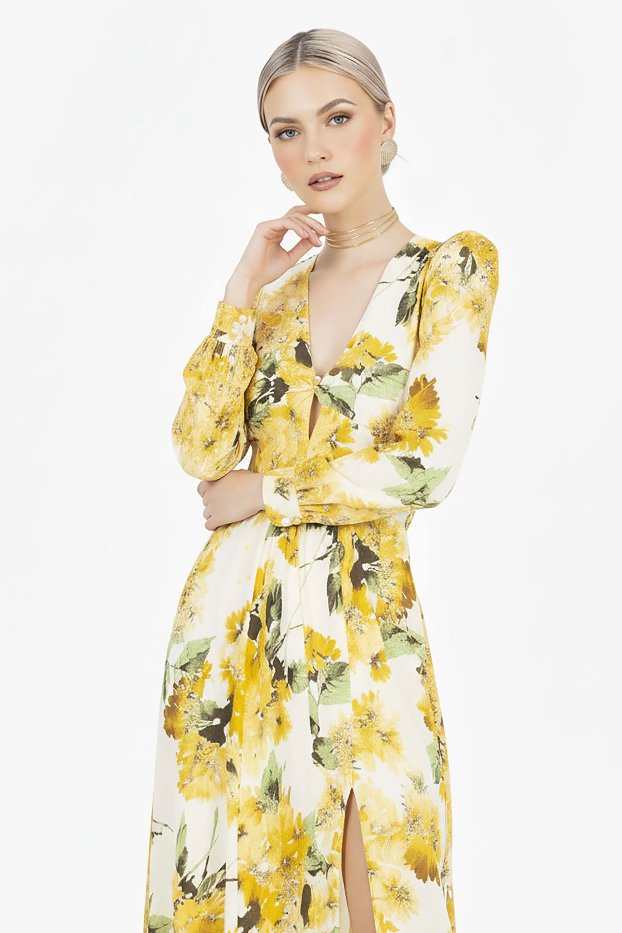 El escote en V aporta un toque femenino y sutilmente sensual, mientras que el cinto forrado del mismo tejido define la cintura y realza la figura con equilibrio perfecto. Las mangas largas con puño abotonado aportan un aire romántico y refinado, ideal para eventos de día, celebraciones al aire libre o cenas elegantes.