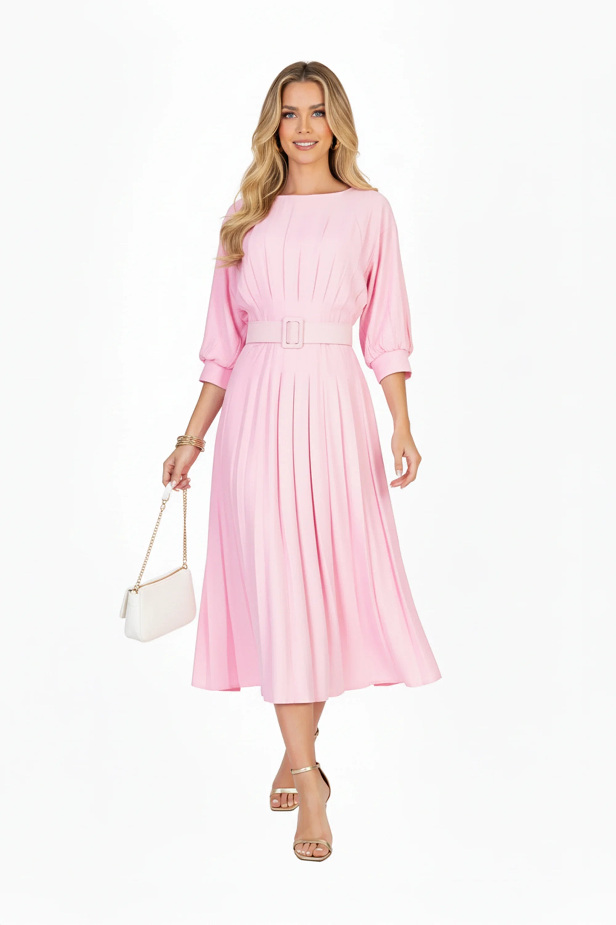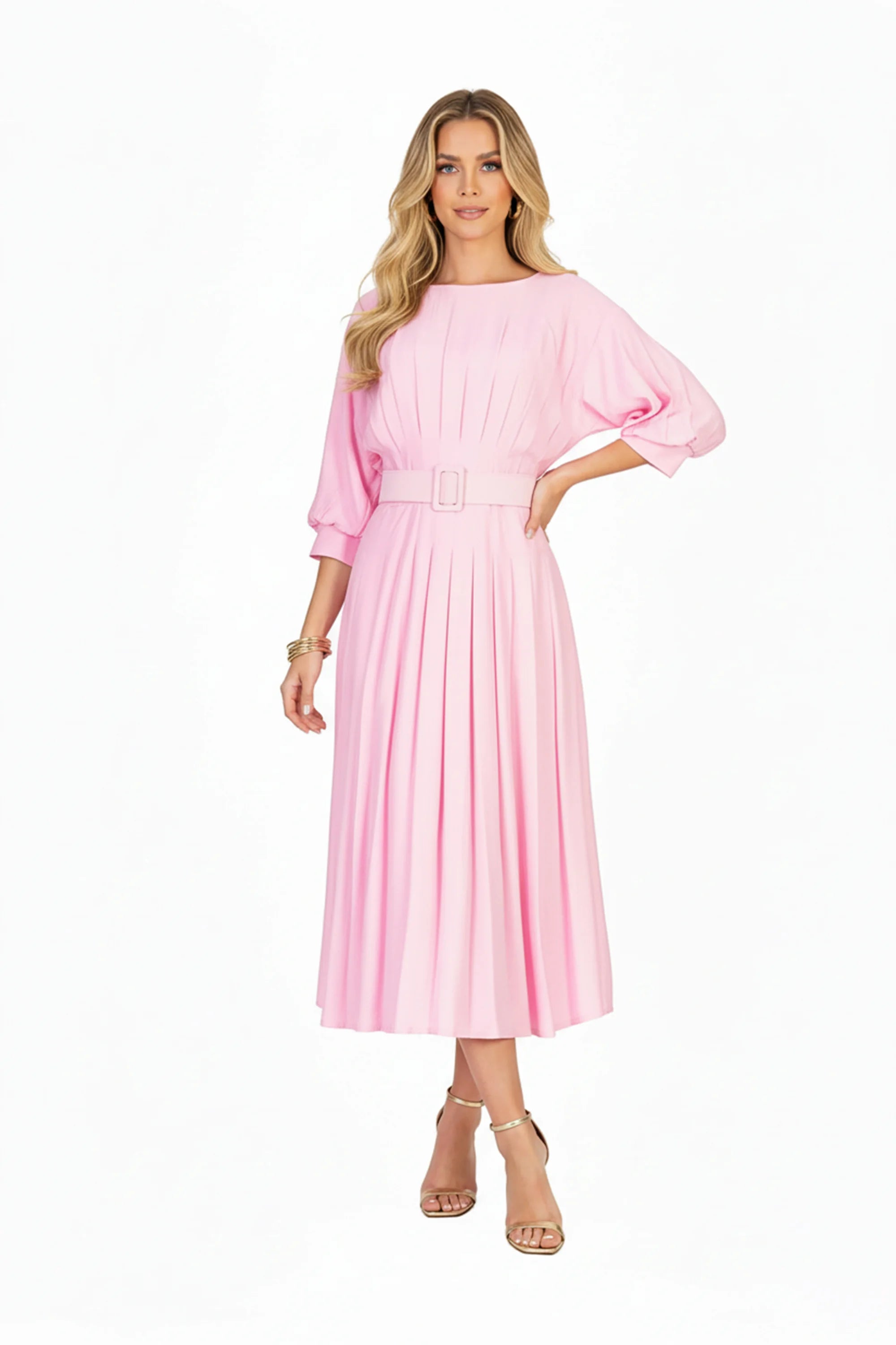 Este vestido midi con pastelones y manga dolman tipo bishop es una joya de inspiración clásica. Confeccionado en un tono verde menta suave, su diseño fluye con delicadeza y estructura, ideal para resaltar la silueta con sofisticación sutil.