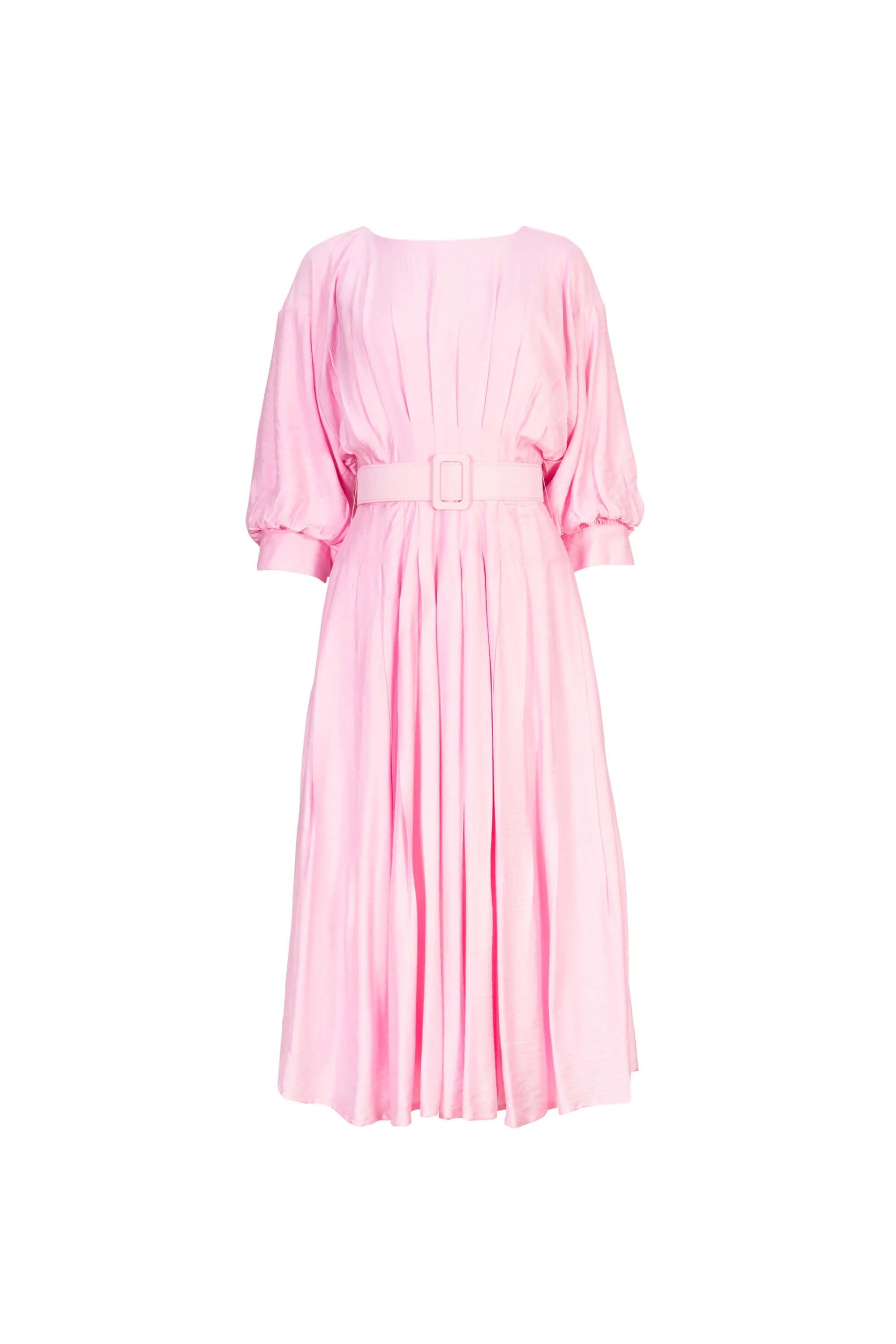 Vestido midi verde menta con pastelones y manga dolman bishop.