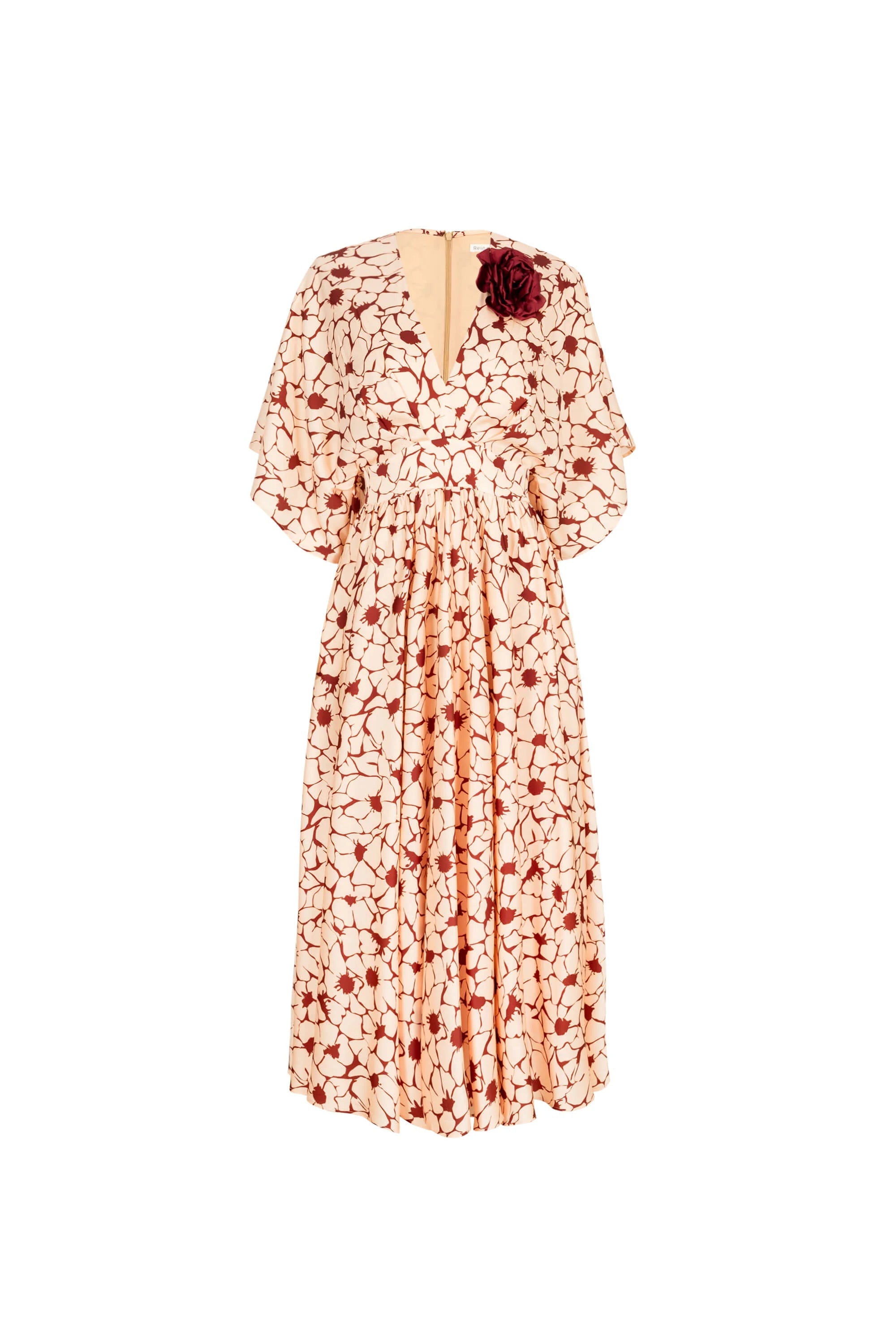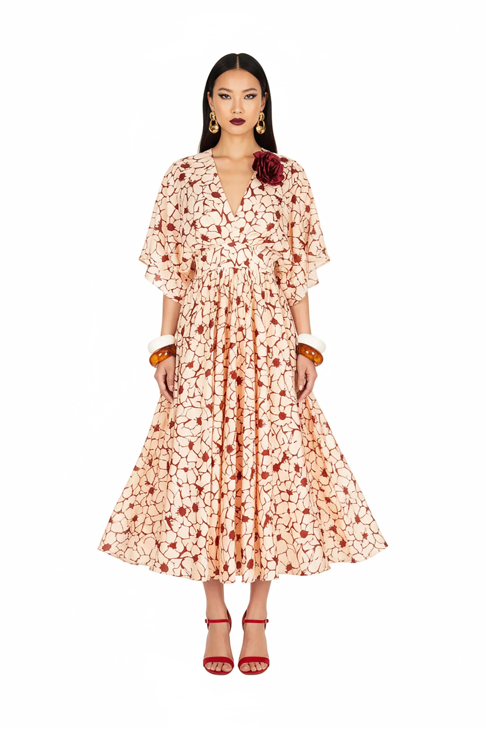 El vestido maxi con escote V y manga pasada es una obra de arte textil que fusiona tradición y modernidad. Confeccionado en un tejido ligero de caída fluida, su estampado en tonos cálidos y naturales evoca un espíritu romántico y sofisticado.