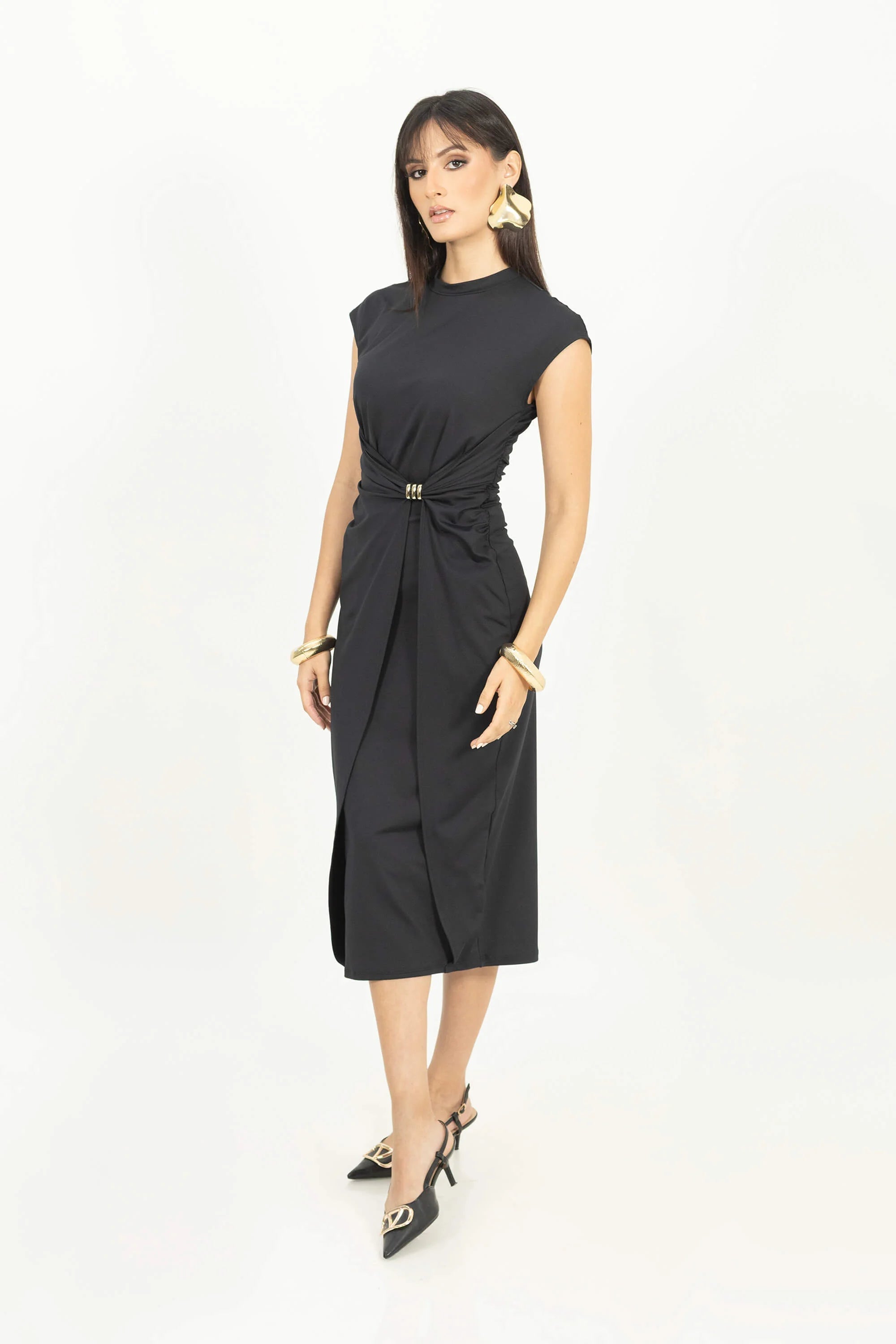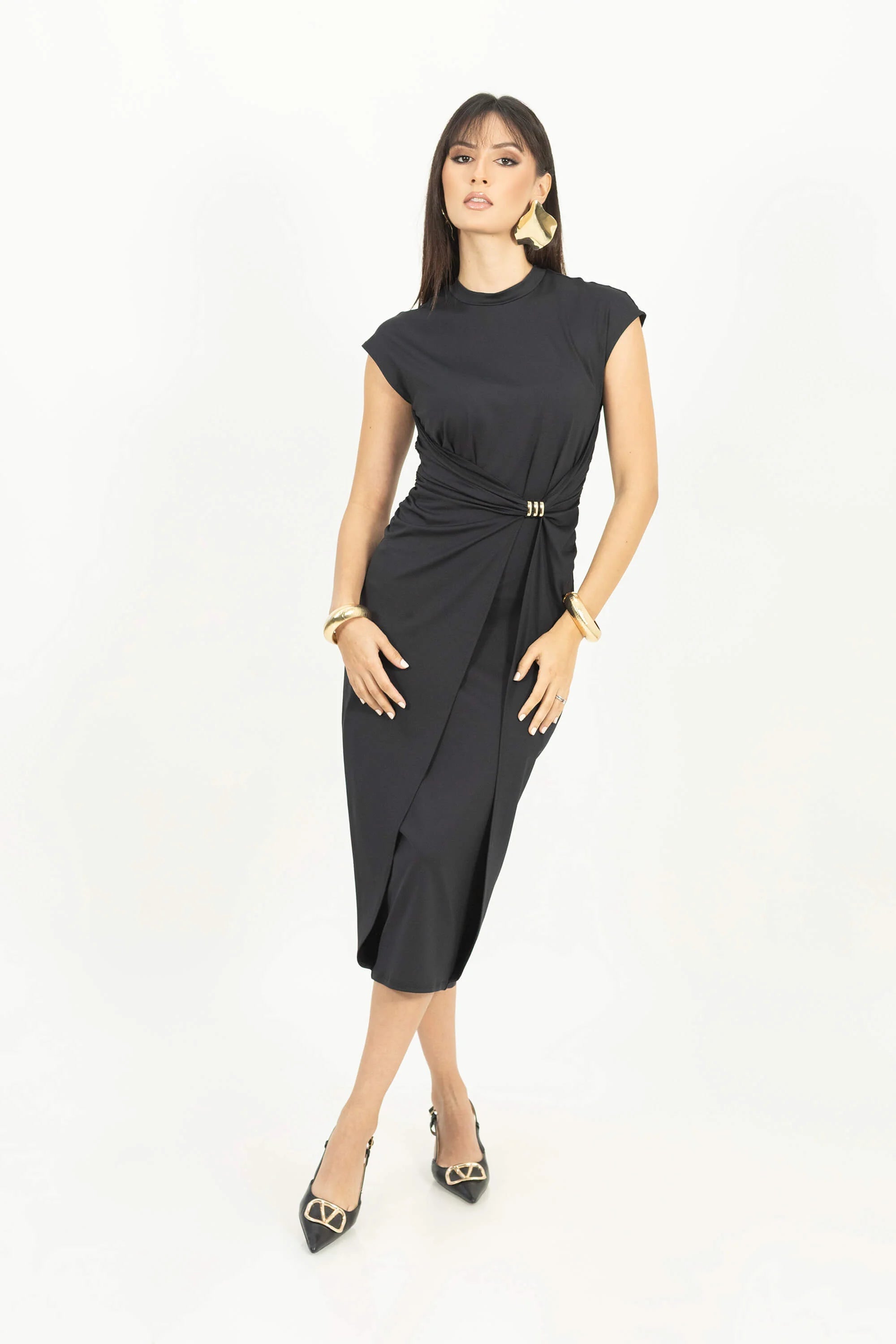 El diseño destaca por su drapeado frontal que nace de la cintura, creando un efecto visual que estiliza y aporta movimiento. El detalle metálico al centro, con pequeños herrajes dorados, actúa como punto focal refinado que rompe la monocromía con discreta opulencia.