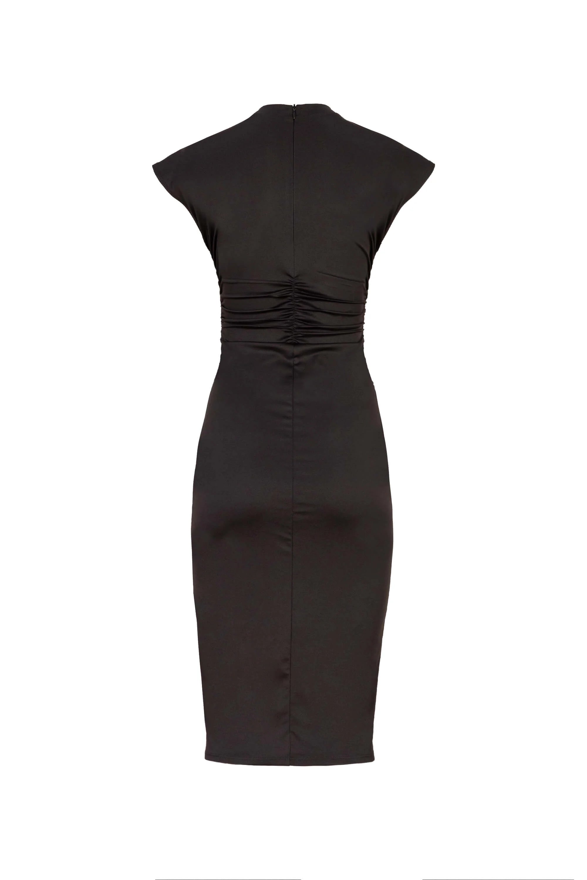 Este vestido negro midi entallado redefine la sofisticación con una silueta pulida, minimalismo elegante y acentos estructurales. Confeccionado en un tejido de punto de alta calidad, su corte limpio se adapta al cuerpo con fluidez y precisión.