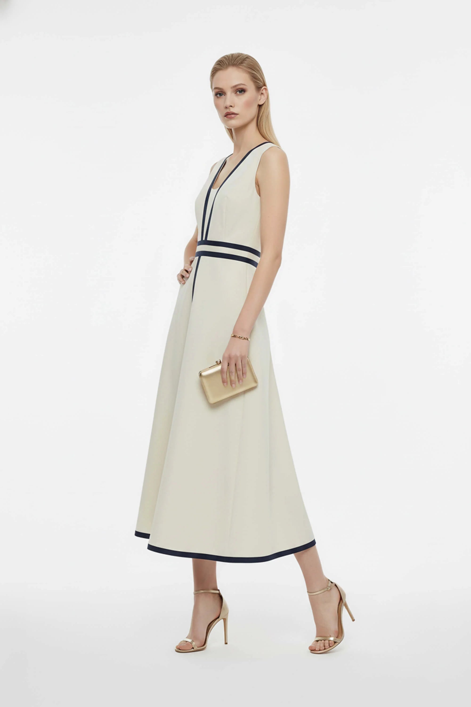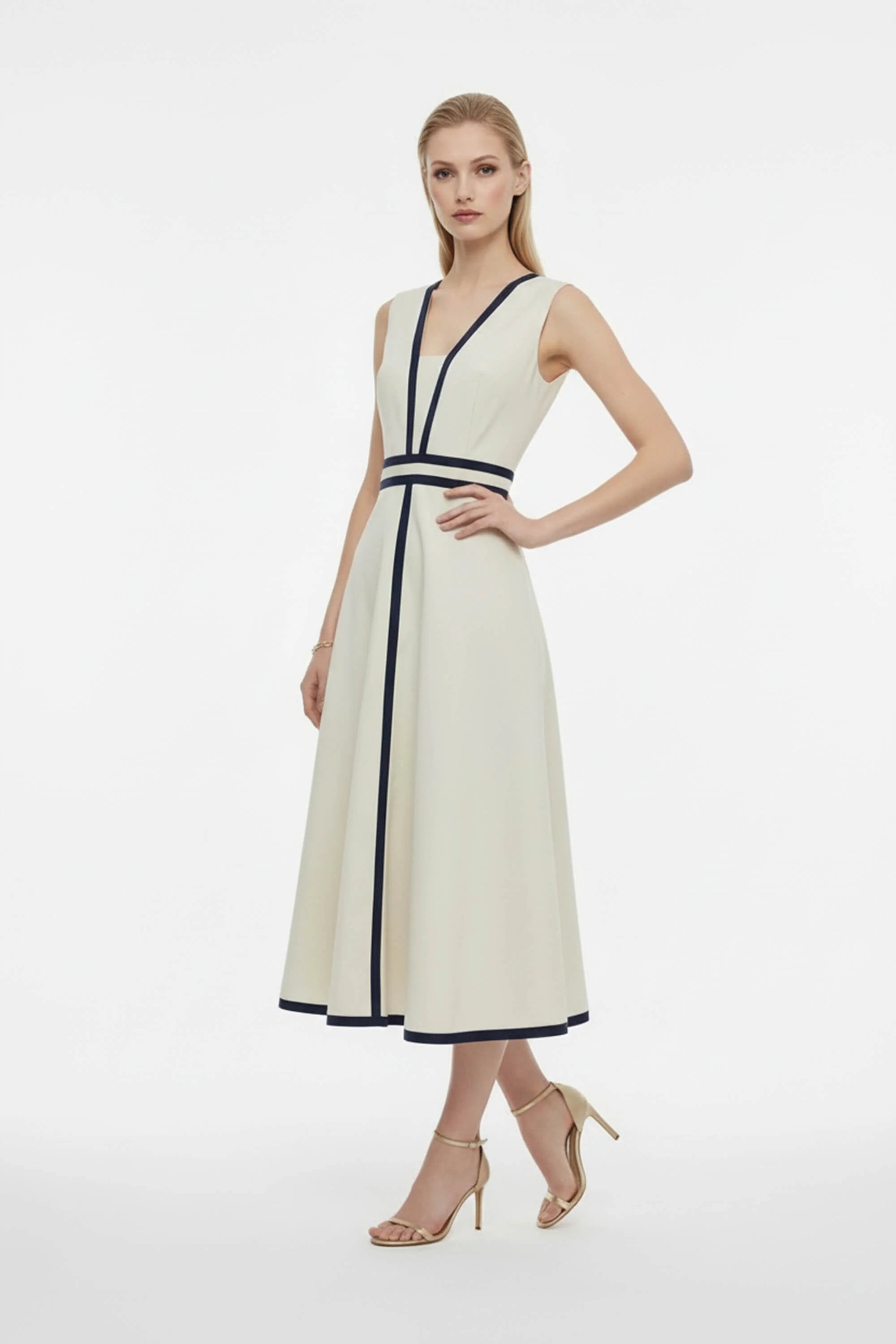 Vestido midi bicolor con detalles gráficos y silueta estructurada