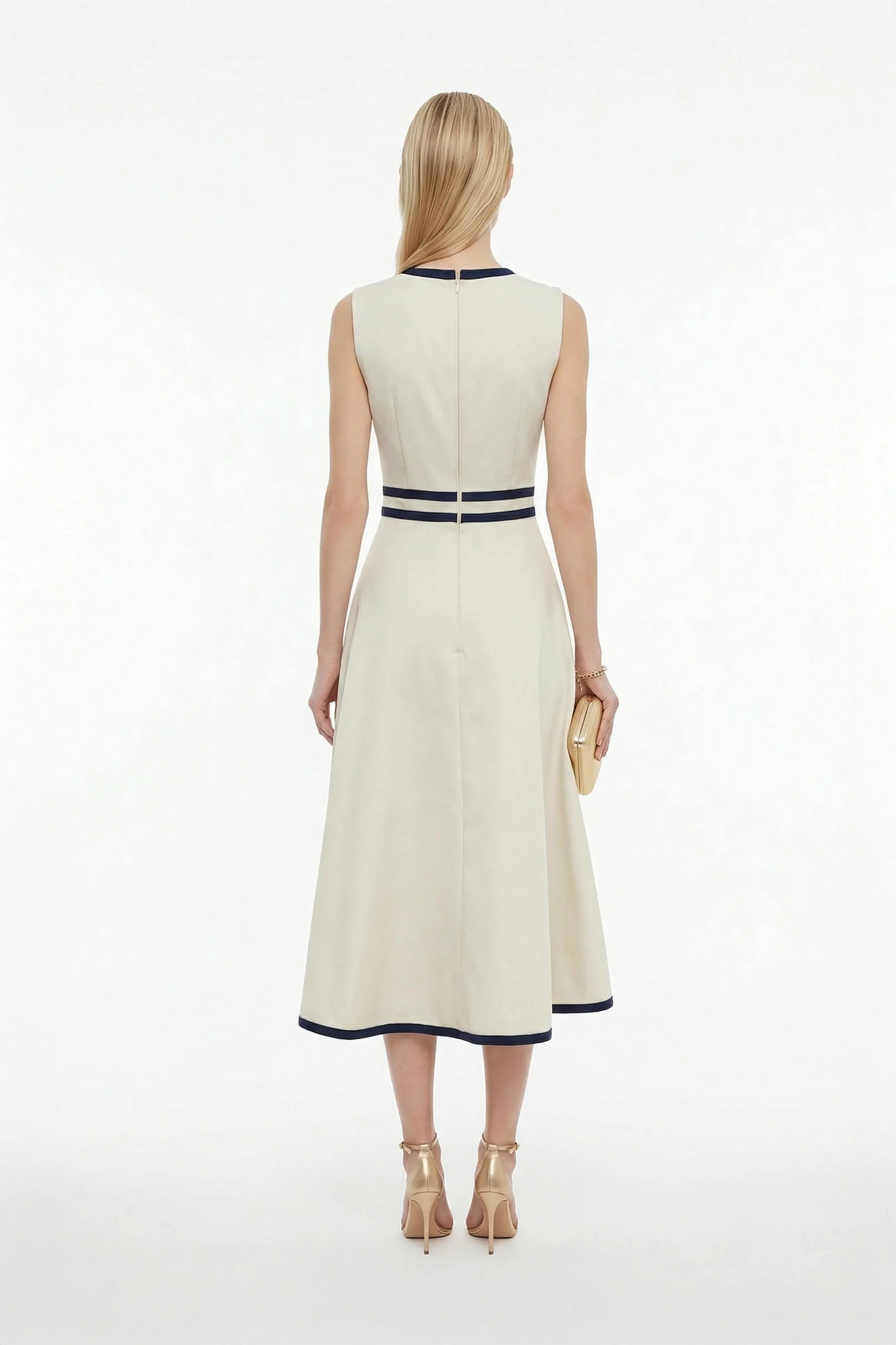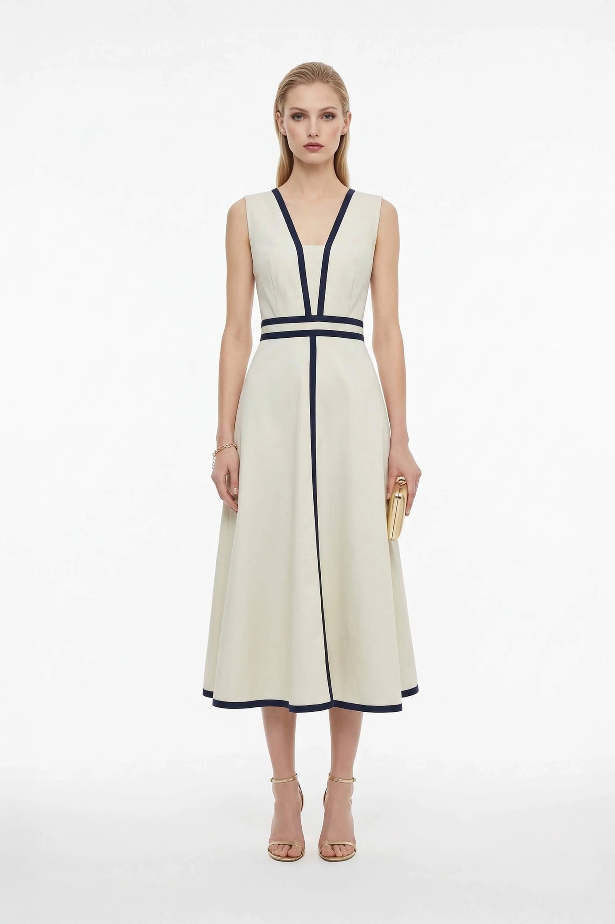 Este vestido midi destaca por su estética moderna y refinada, ideal para quienes buscan una pieza elegante con un toque contemporáneo. Su diseño bicolor combina tonos neutros con acentos en contraste, creando un efecto visual limpio y sofisticado.