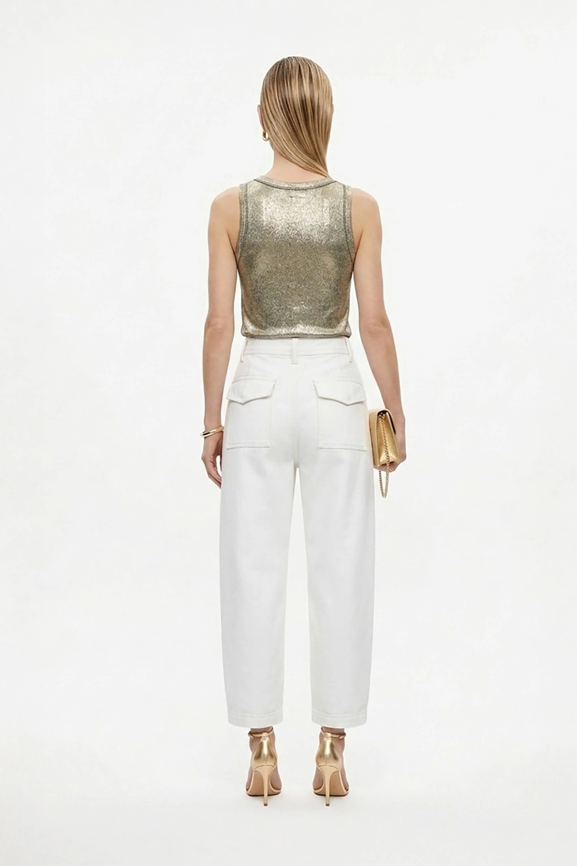 Este top destaca por su impecable silueta entallada de estilo deportivo y cuello redondo profundo (scoop neck), diseñada para enmarcar el torso con una elegancia minimalista y una presencia de diseño funcional. El punto focal de la pieza es su acabado de ribete acanalado en escote y sisas, que aporta una estructura técnica y una durabilidad superior a los bordes. Se caracteriza por una estética limpia sin costuras frontales visibles, proyectando una imagen de lujo contemporáneo y confort absoluto.
