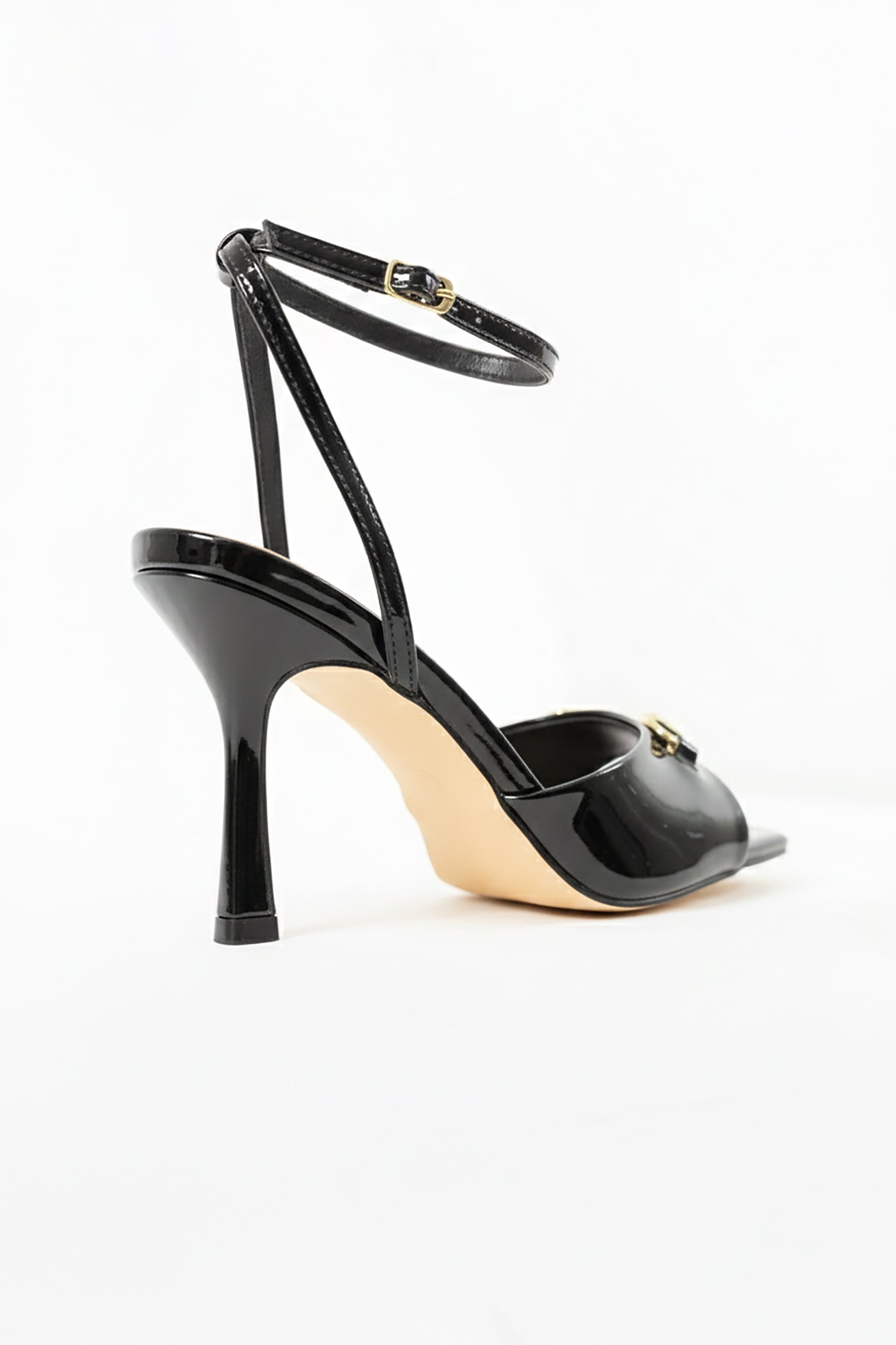 Estas sandalias son una declaración de lujo absoluto y feminidad empoderada. El modelo destaca por su vibrante acabado en charol de alto brillo, diseñado para ser el centro de atención. El punto focal es su refinado herraje metálico tipo horsebit (eslabón ecuestre) en dorado brillante situado sobre la tira frontal, que aporta un aire de nobleza clásica y exclusividad. La silueta se completa con una punta cuadrada contemporánea que equilibra perfectamente la estética retro con las tendencias actuales de pasarela.